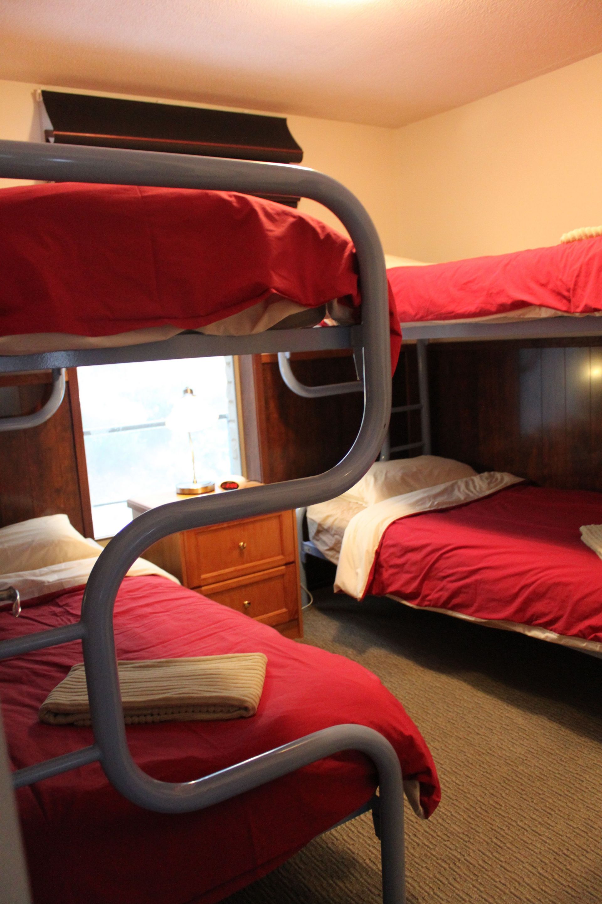 Two bedrooms have queen beds that can be split into singles, and the third bedroom has two bunk beds, and all have great views into the snowy landscape.