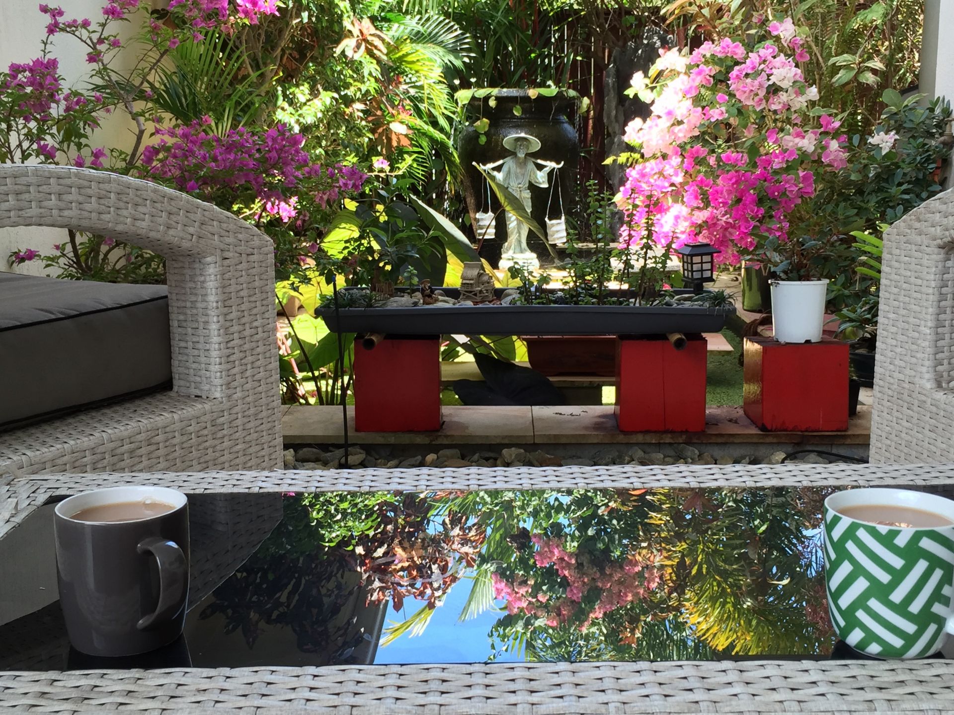 An outdoor setting is close to our pond and water feature which includes a family of goldfish and sub tropical fresh water species, which add to the relaxing mood set by the sound of running water.