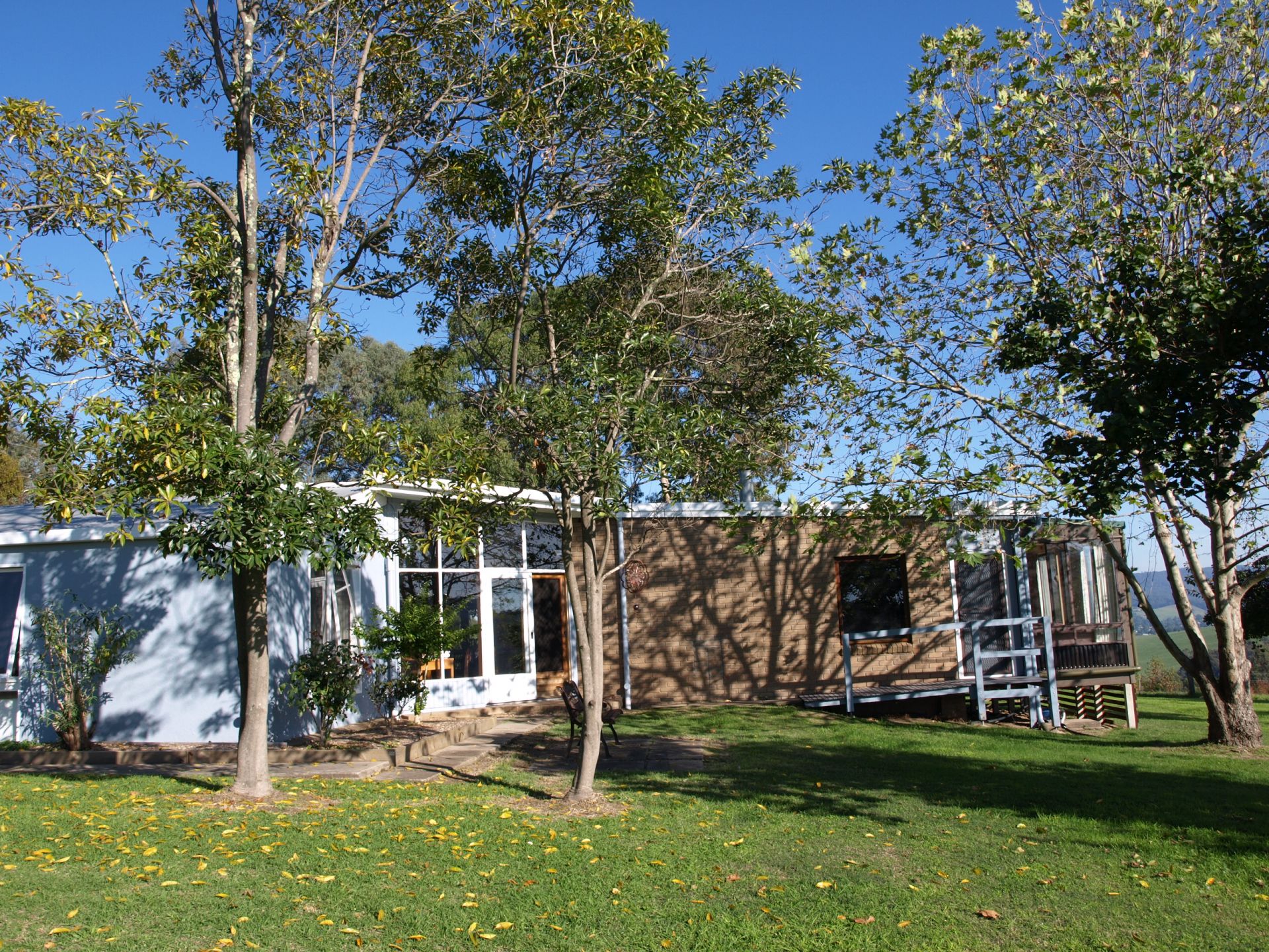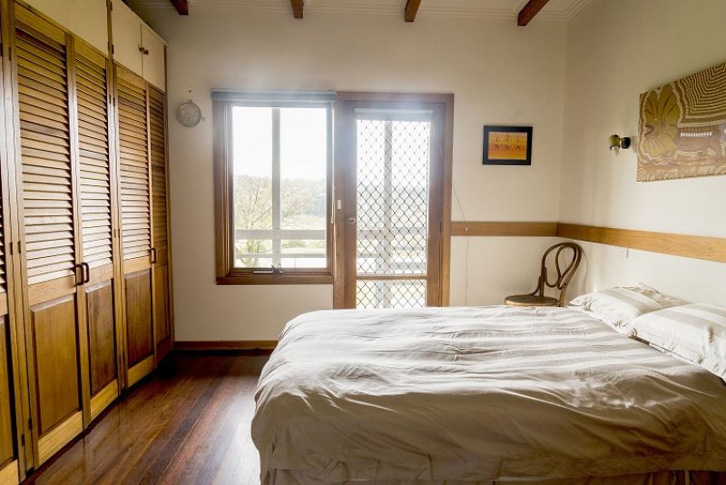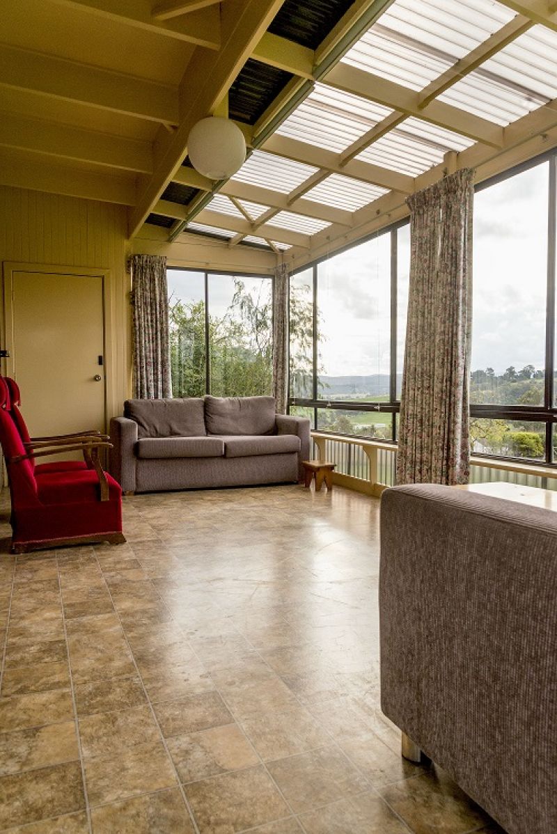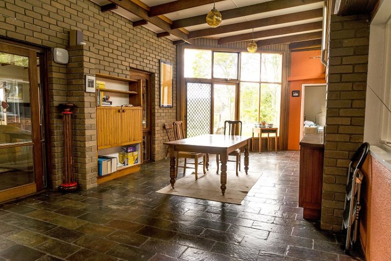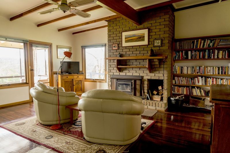 The house is unusual and needs to be seen to be appreciated. It is 44 square and primarily of double brick construction with high ceilings, slate & timber floors and open views across the Bruthen valley to the hills beyond. There are 3 large bedrooms with BIR (2 opening to veranda), 2 bathrooms, 3 living areas and a north facing sunroom. There is a wood heater, reverse-cycle air conditioner and ceiling fans in living rooms and bed rooms.
