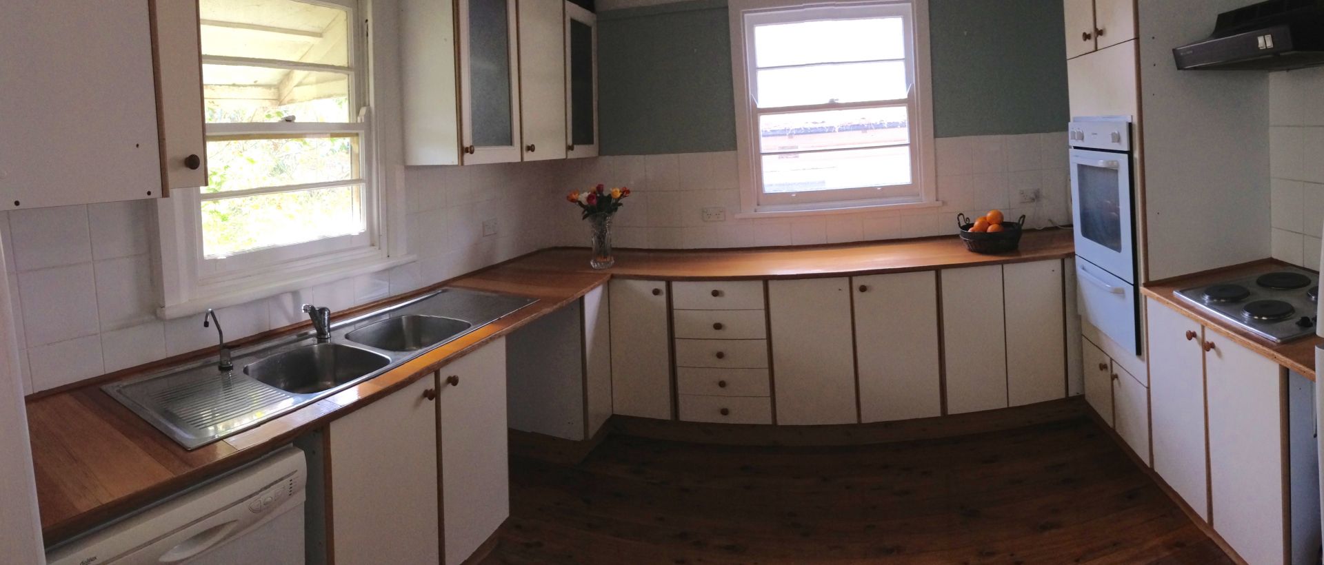 The open plan kitchen has plenty of bench space, a dishwasher, electric wall oven and stove top.