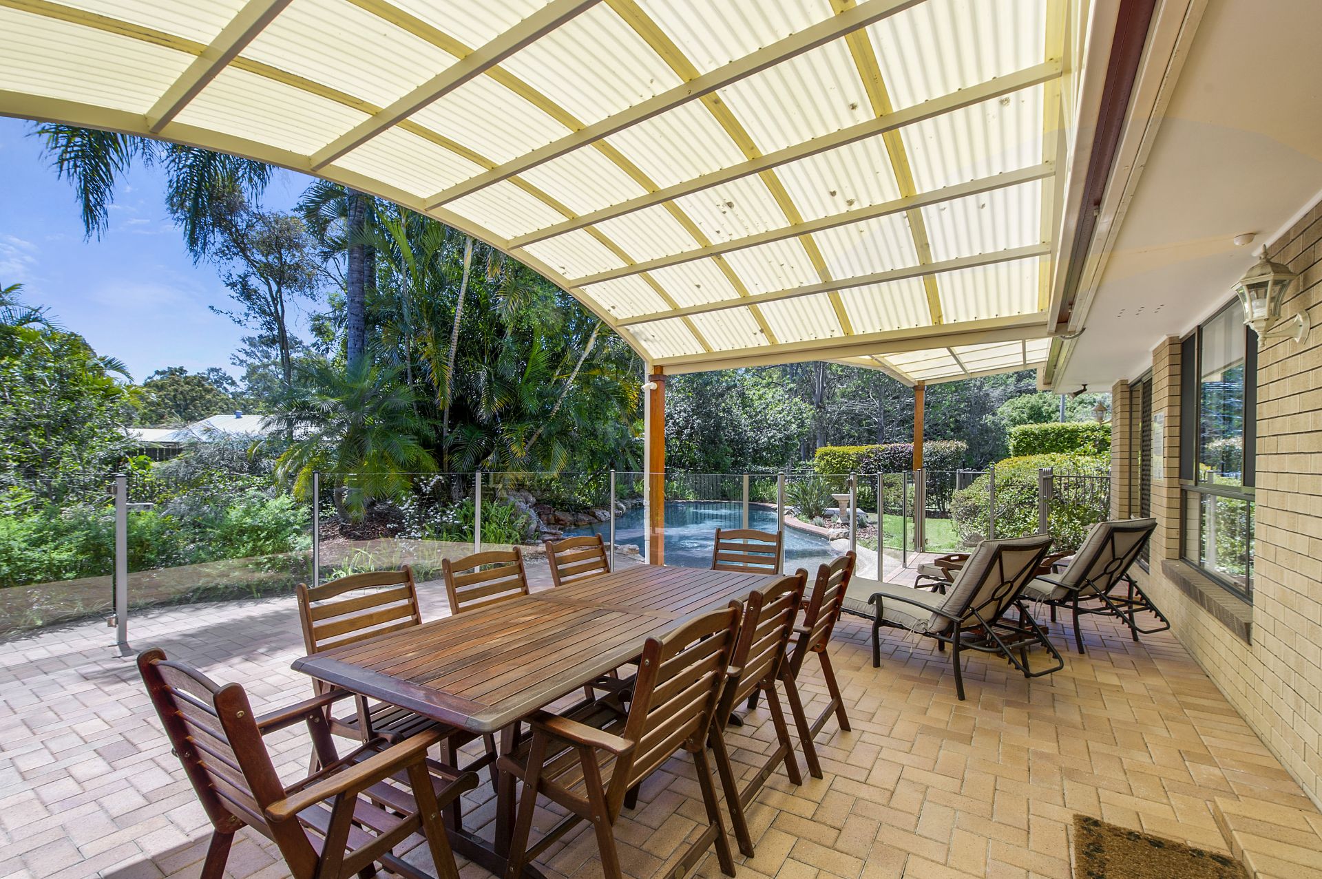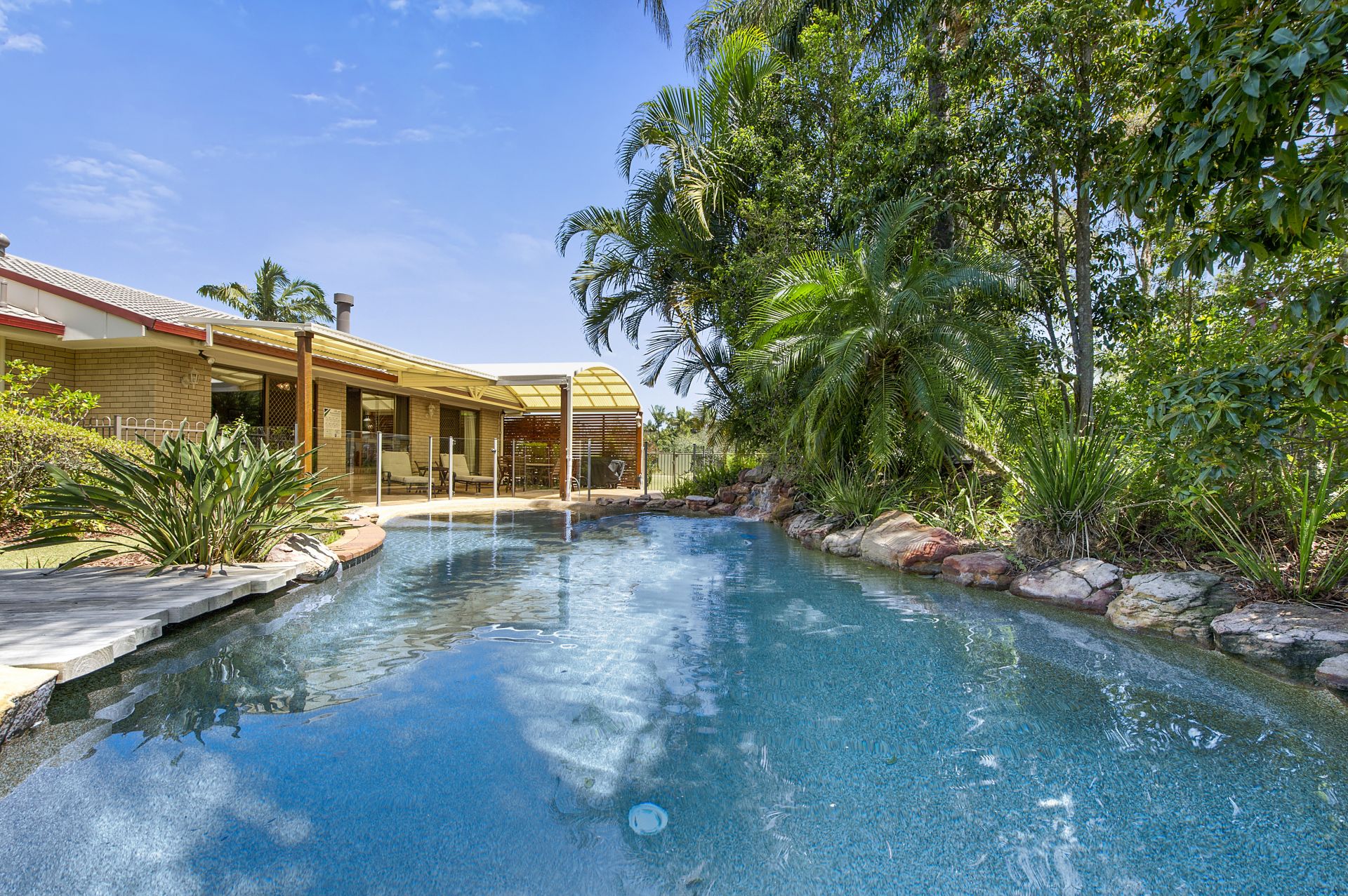 Living areas open out to a large covered patio area and stunning salt-water pool with waterfall, pebble beach and landscaped gardens.