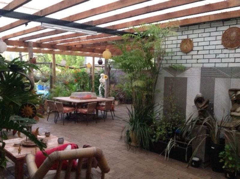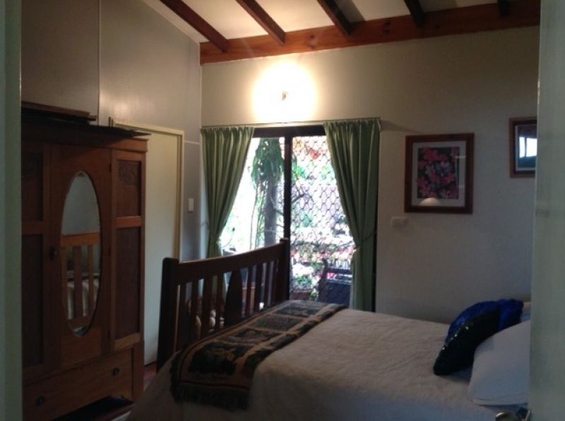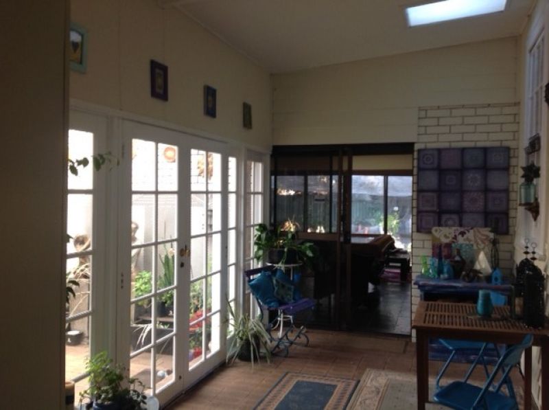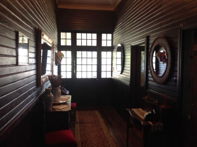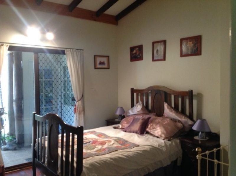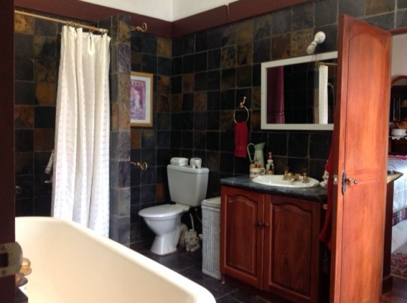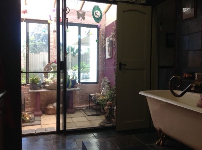 The main bedroom has built in timber robes, an open fireplace with ornate mantelpiece, timber dados and floor. A large ensuite bathroom, lined with slate and featuring a claw foot bath leads off the main bedroom. The ensuite has an atrium /sunroom attached.