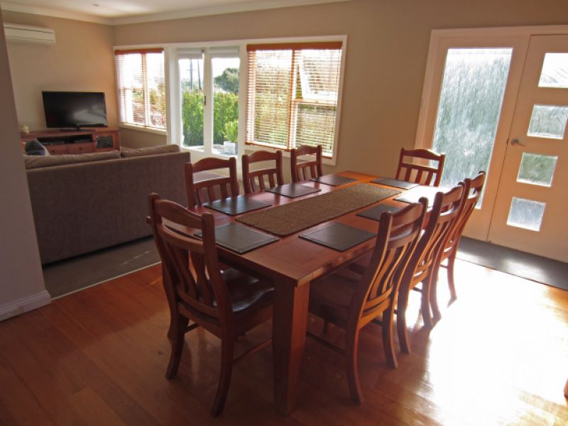 The modern renovations maximise the light and space of open-planned living, with wooden floorboards. The kitchen, dining and lounge room flow together and there are glimpses of the mountains and city lights.