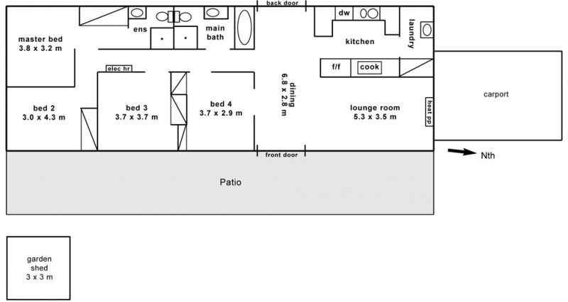 All four bedrooms have built-in wardrobes. There is a large heat pump as well as an electric wall heater, and energy-saving LED downlights inside and outside.