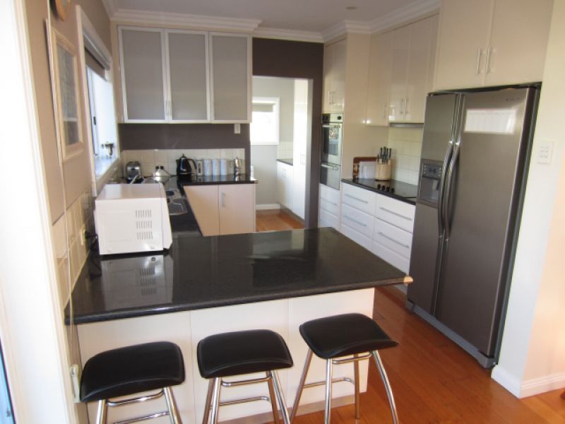 The internal laundry adjoins the kitchen, which has a water filter on the sink, as well as a plumbed side-by-side fridge with icemaker. Both bathrooms have stunning stone-top vanities, the main with spa bath.