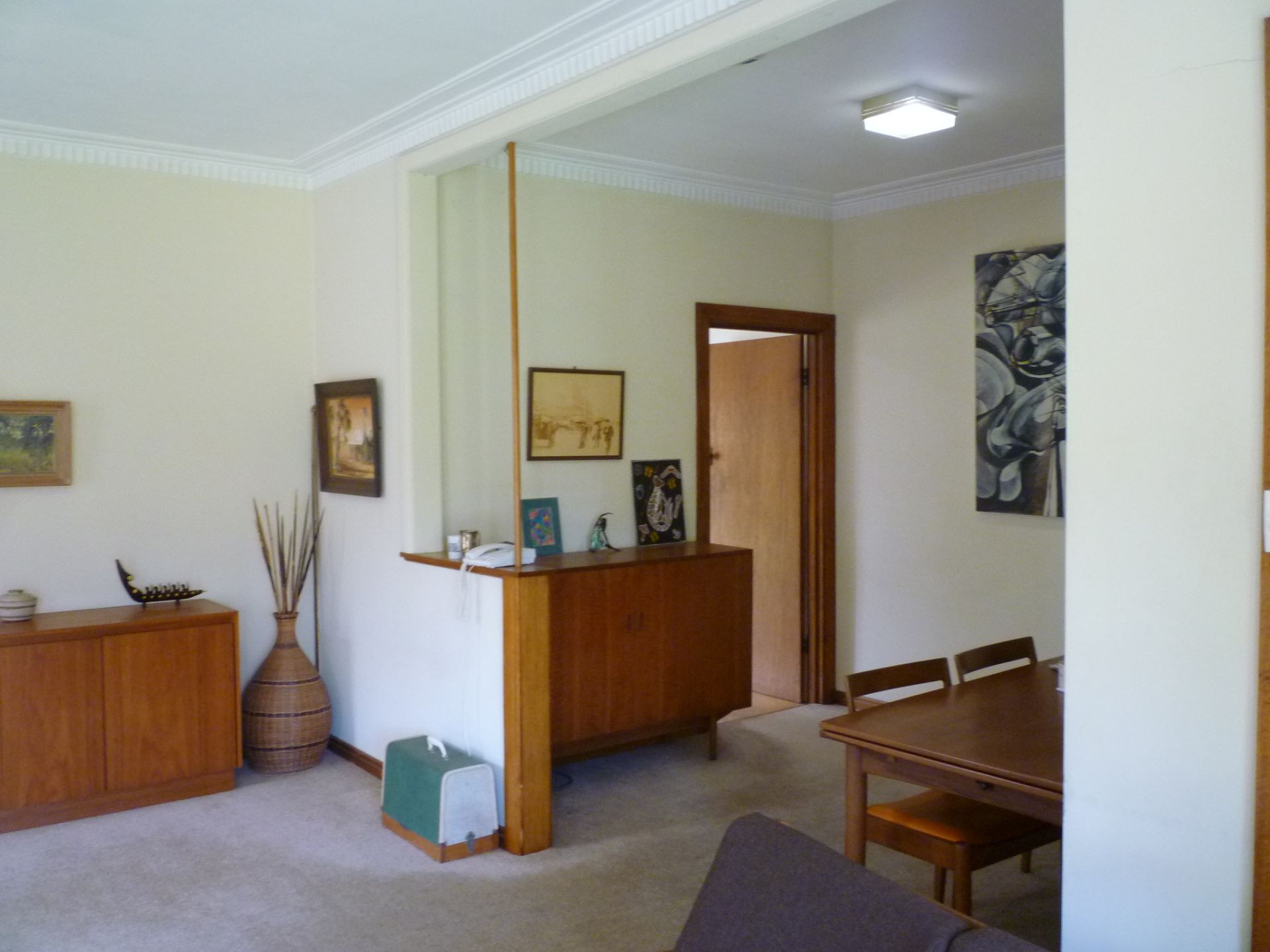 This 1950s vintage cream brick veneer home has been creatively expanded in the 1980s, with the kitchen opened up to a large family room, and an added fourth bedroom.