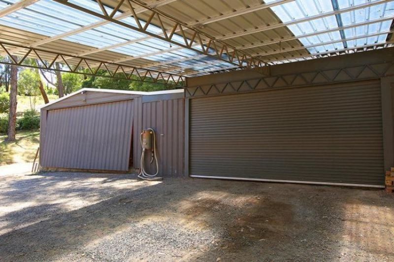 The carport also provides covered access to two huge fully powered, lockable and inter-connected garages. The size of the garages equates to an eight-car garage, currently used as a large workshop housing large machinery and storage for a roofing business. There is also extra storage in a separate 7.6 x 2m shed at the side of the garages and an another large under cover storage area at the back of the sheds.