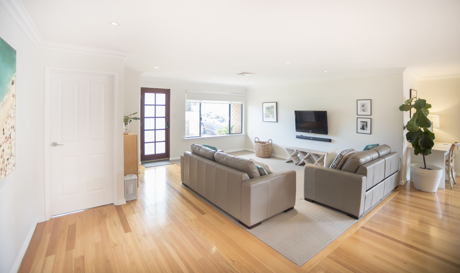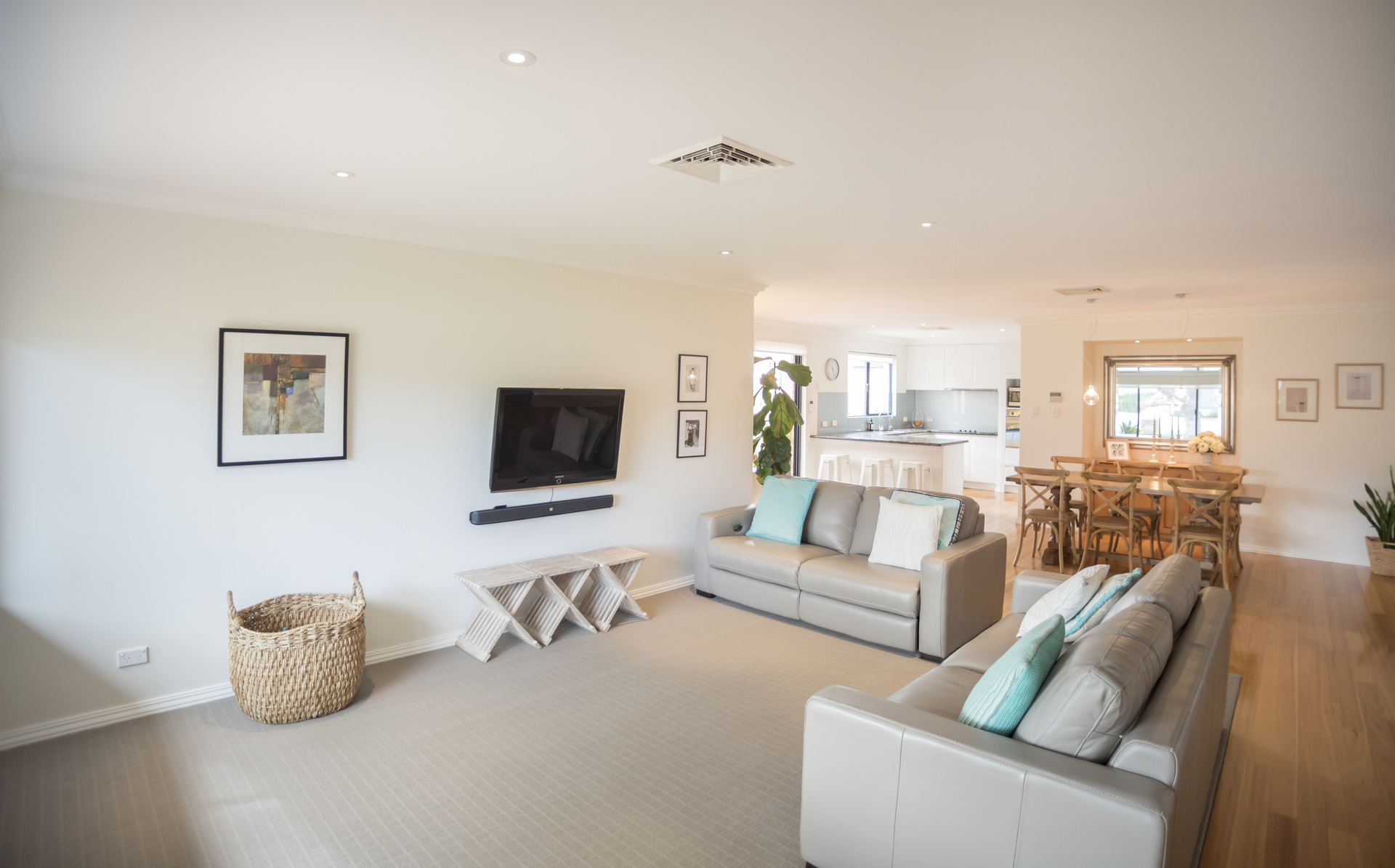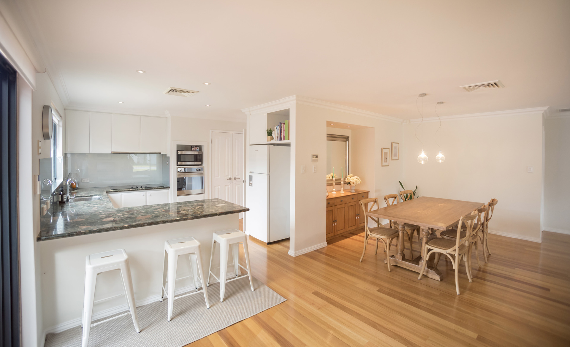 From the lawned front garden on a lovely street, enter through the keyless front door into an unusually large heart of the home. The living zone is carpeted and solid blackbutt timber flooring leads to the large dining area with space beyond for a desk/study nook.