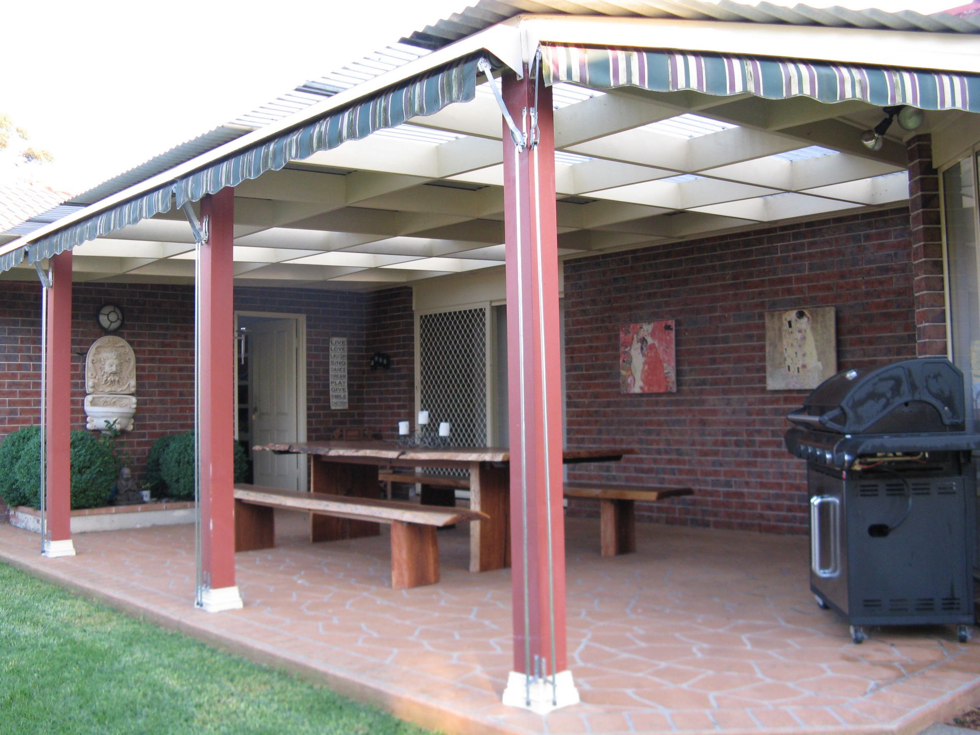* Outdoor covered pergola area with water feature and roll down canvas blinds to block out rain and sun.
