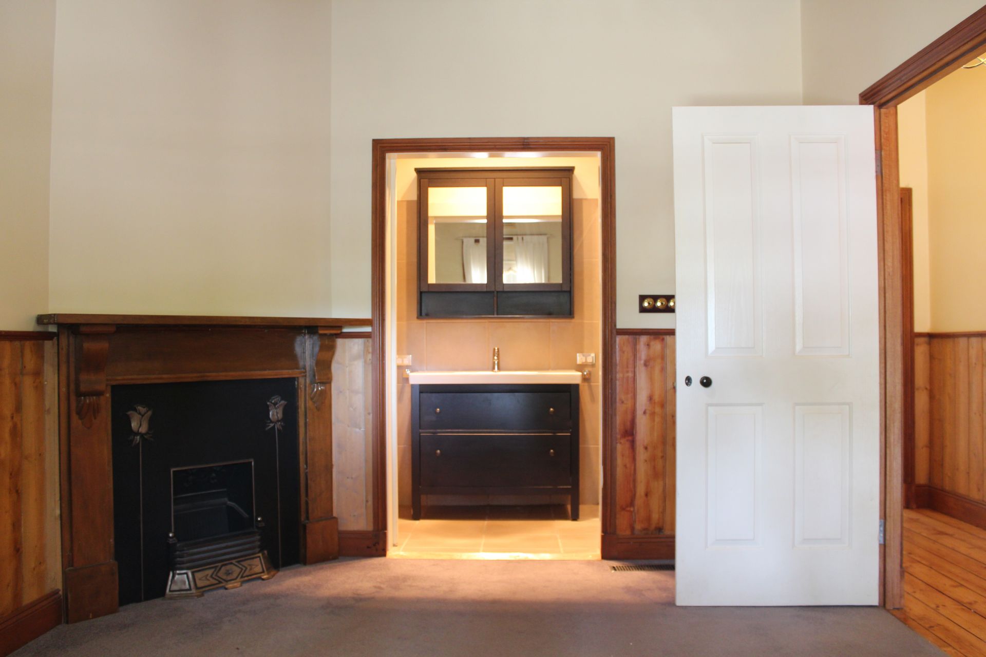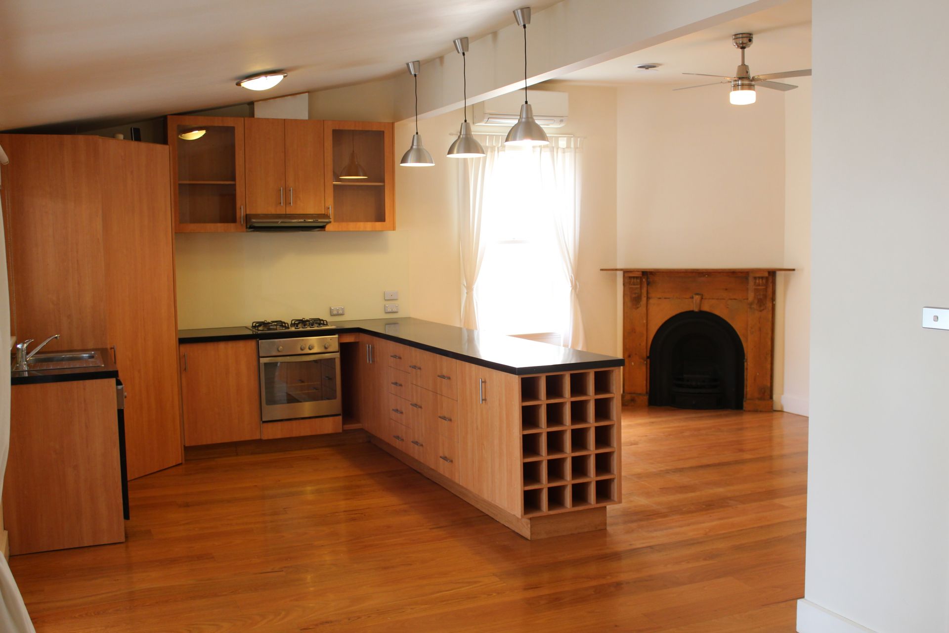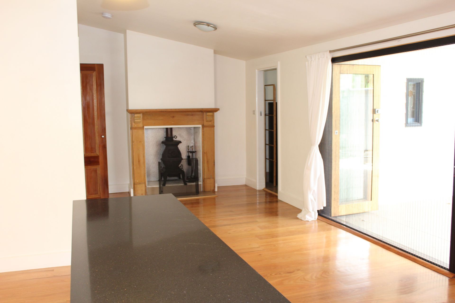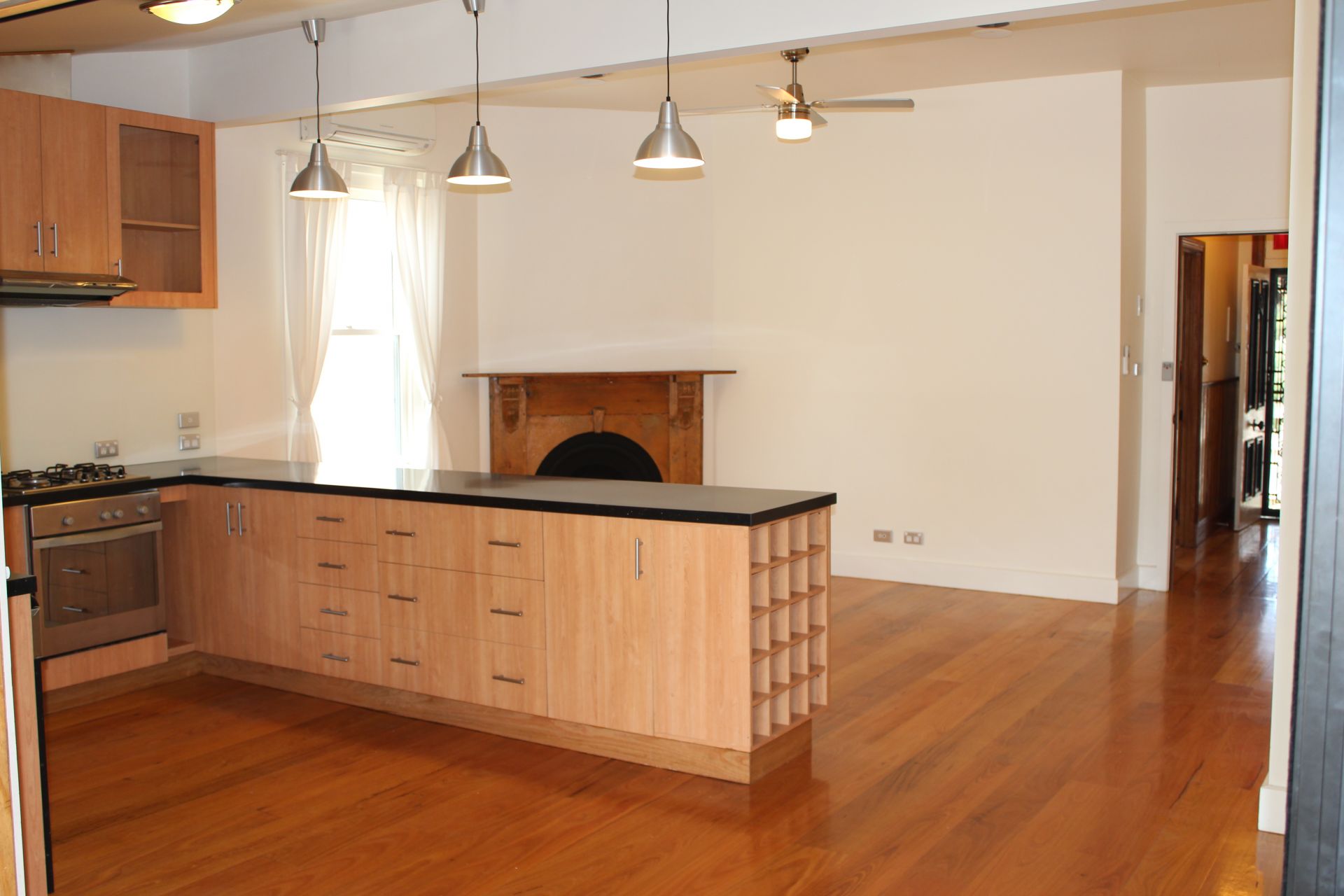 The polished timber floor of the entrance hall leads into the surprising open plan kitchen/dining/living area which has the original Victorian fireplace contrasting the modern clean lines of this light open space.