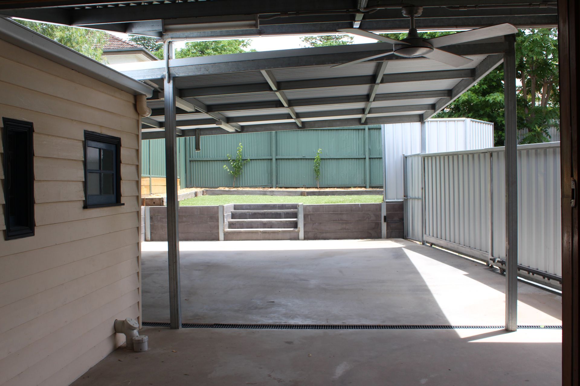 The outdoor space is under cover with an outdoor ceiling fan and the yard is dominated by the solid steel 2 car carport, secured by the remote controlled bi-sliding gate and sensor lighting. A compact elevated lawn space is accessed via landscaped steps up through the slate grey concrete sleeper retaining wall and has the convenience of new steel fencing and artificial turf to ensure low maintenance and privacy.