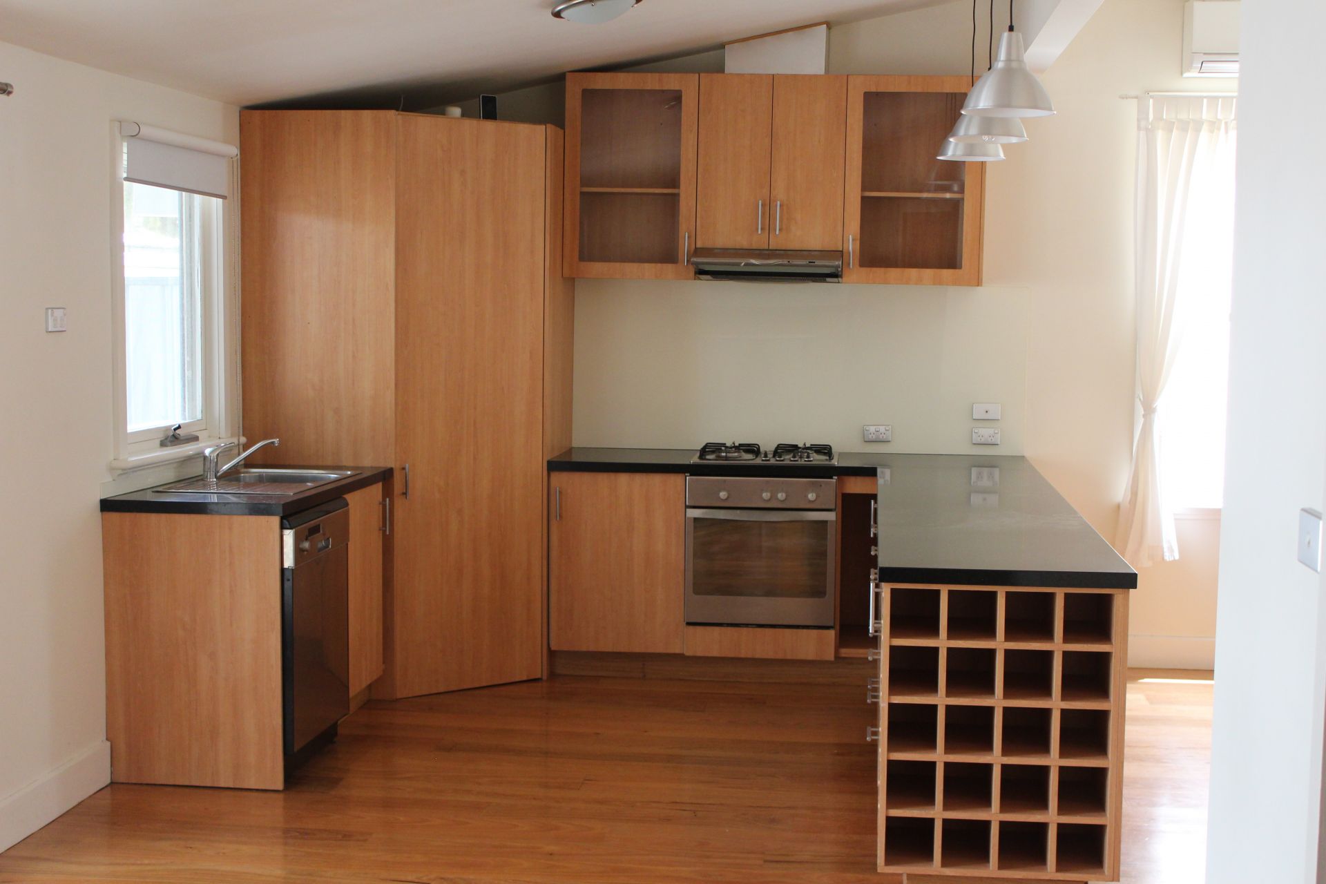 The modern spacious kitchen includes a 4 burner gas cook top with stainless steel electric oven and range hood, dish washer and pantry, with the adjacent dining space located next to the outdoor area, accessed via the double glazed, timber trifold doors. A concertina single draw screen at the rear entrance enables the house to be opened up for full air flow and indoor/outdoor amenity, while keeping unwanted insects at bay. In the cooler months the cozy pot belly stove in the original fireplace provides a classic feature as well as the warmth of a wood fire.