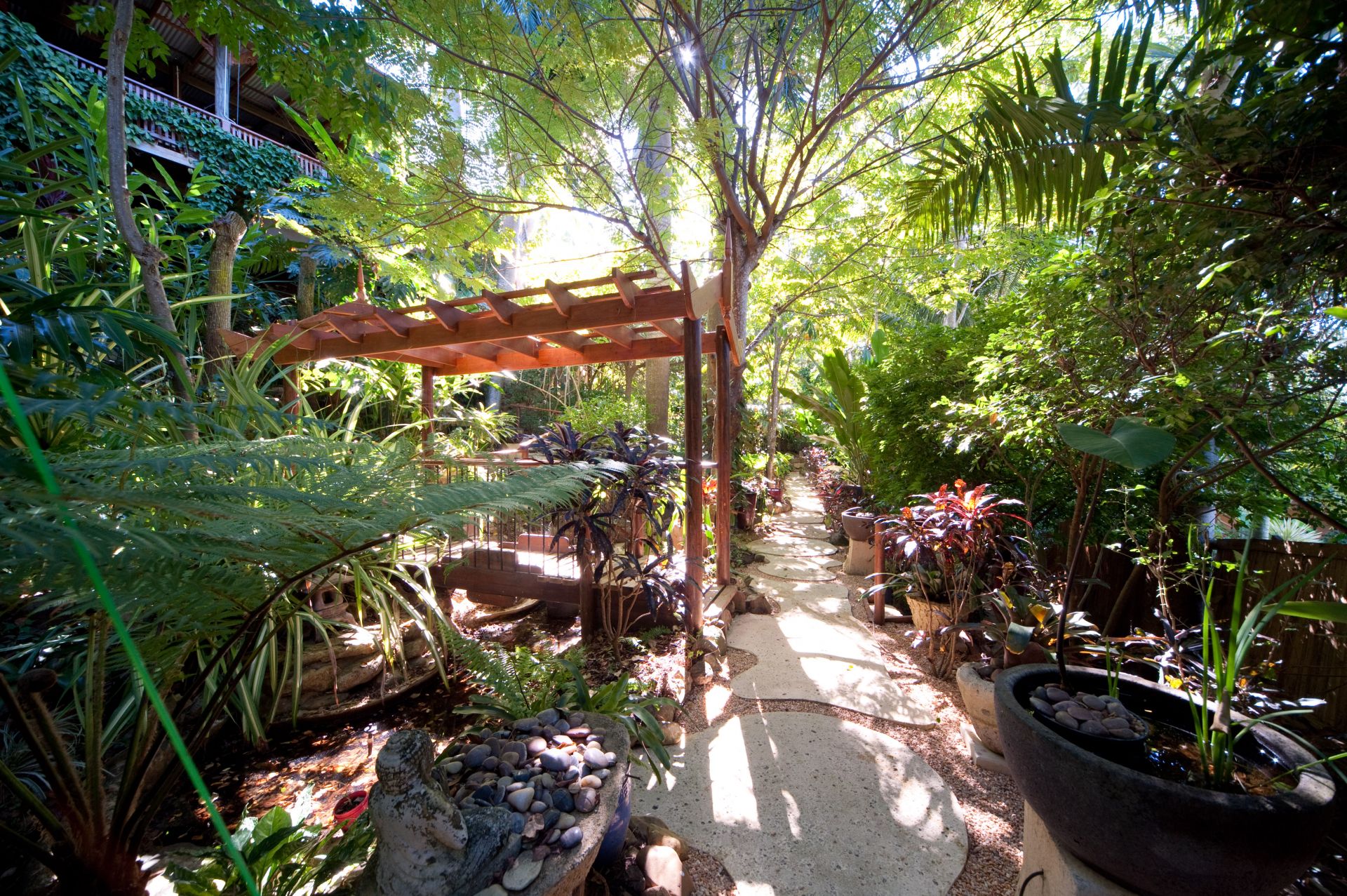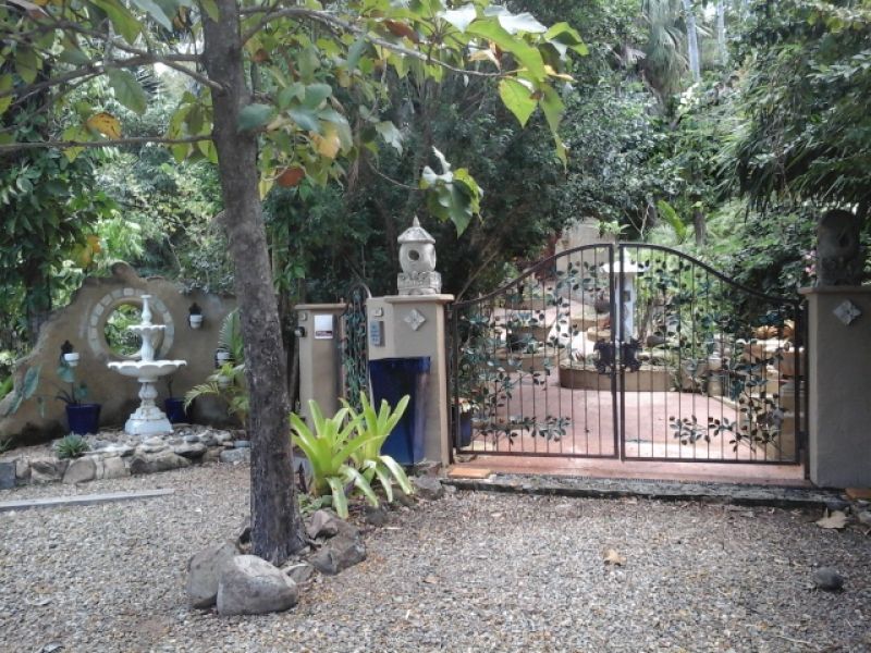 As you enter this property through the front wrought iron gates decorated with vines and roses, you will be transfixed by the tranquillity of the tropical gardens that have been screened on National TV. With no grass to mow, just gardens, pathways, statues and water features, this property boasts many quiet nooks to relax in or enjoy a cup of coffee with friends, be it a rock seat, a garden room, a pavilion or the temple.