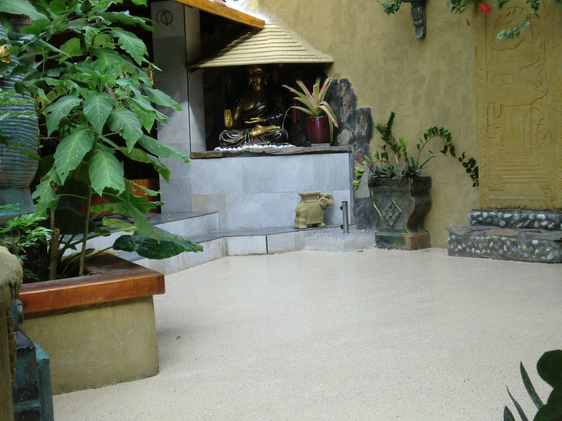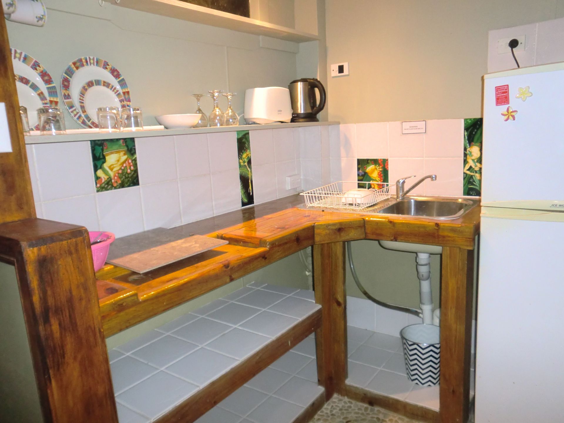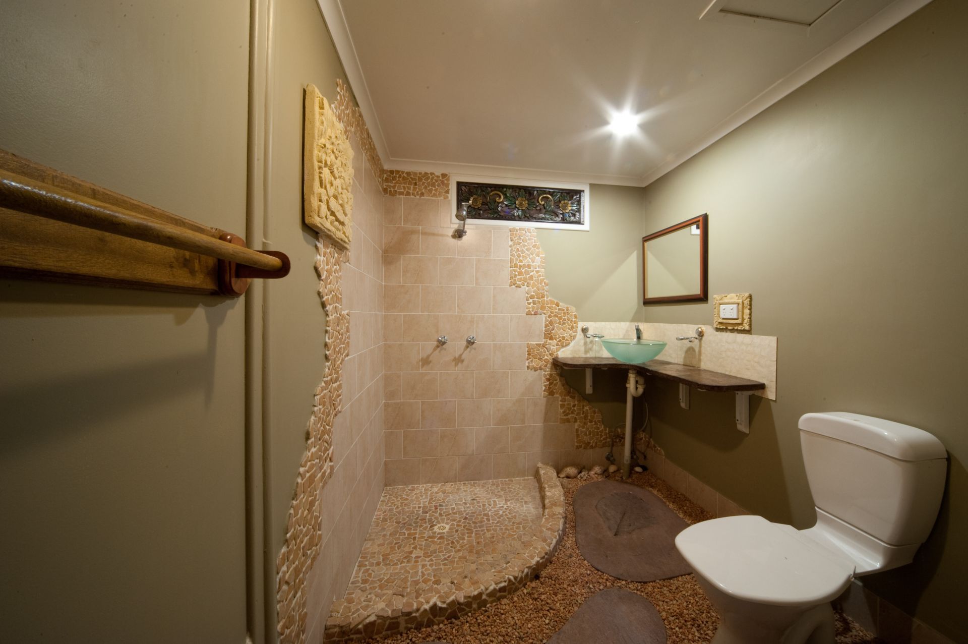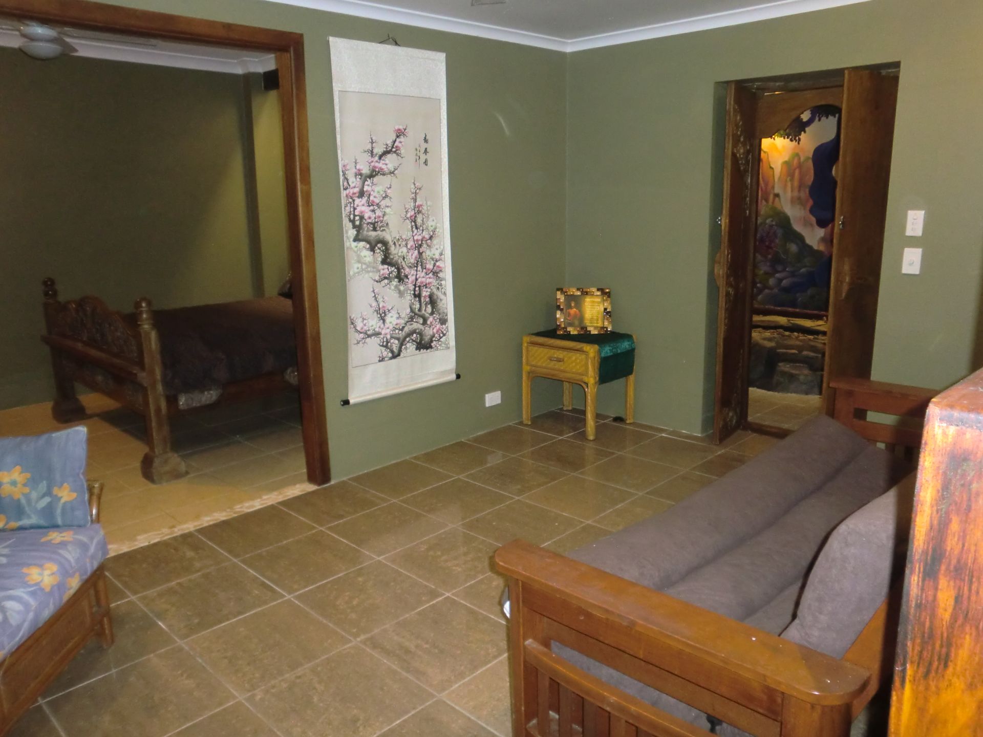 Downstairs is separated by two living areas plus an office or extra bedroom if required. The larger living area is a self-contained one bedroom a/c flat with an outdoor veranda and a private laundry. Often used for long term rentals and hosting family members. The second a/c living area has its own kitchenette, patio, living-room and bedroom. This has been used for short term rental and miner's rental in the past, and is perfect for visiting guests. At the front of the house, through a separate carved wooden teak door is a space we used as our office for many years. It is currently set up as a meditation room.