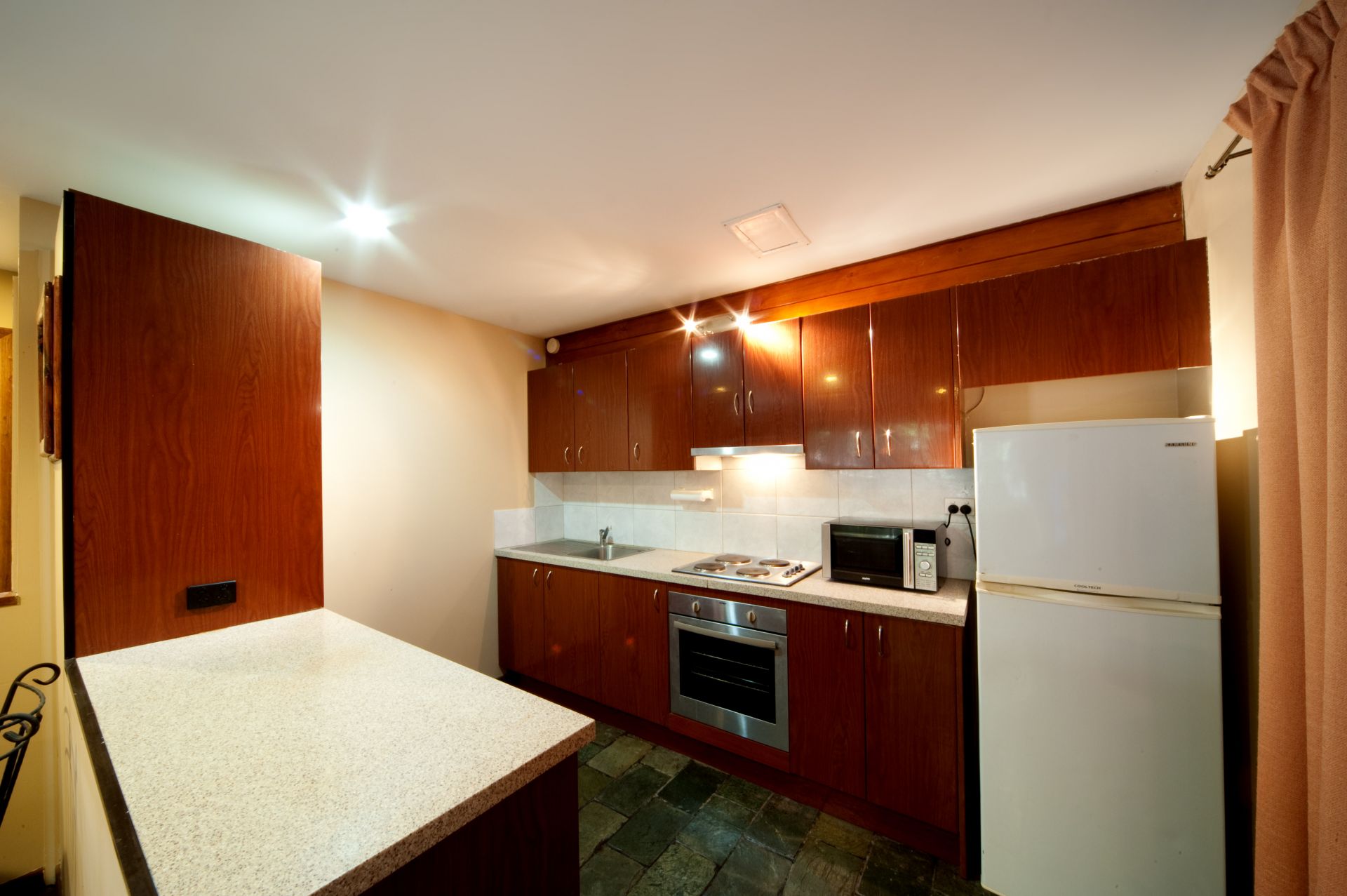 Upstairs is a high class spacious 1 bedroom home with a sunroom that you could easily change into a bedroom if needed. Features bi-fold doors that open out onto a large veranda with valley views, polished floorboards, wood and marble features, stainless steel kitchen bench tops with brass gecko cupboard door handles and cathedral ceilings.