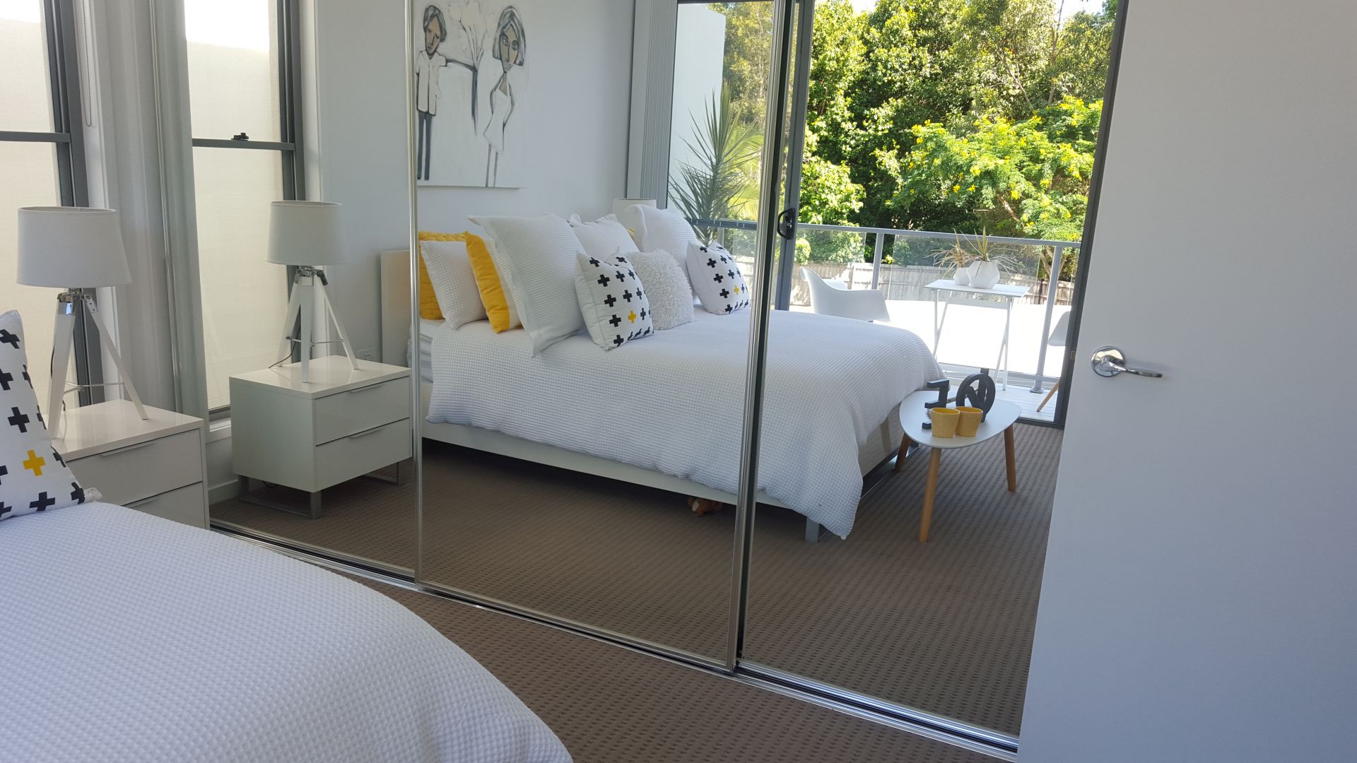 A complete wall of wardrobe space with mirrored doors make for lots of storage space.
