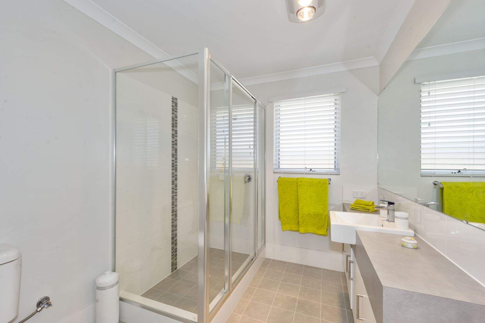 The main bedroom has a wall of mirrored built in robes with 2 trouser racks and half hanging space above each. There is also a third section of double hanging and shelves for shoe boxes in between each hanging space. If you would prefer more hanging space the shelves are removable. The other two bedrooms have built in robes with mirrored doors. The large ensuite has a huge shower and full length double vanities, power points and waterfall taps with a separate toilet. The main bathroom also has a large shower and vanity with a second toilet. Both bathrooms have fan/heaters.