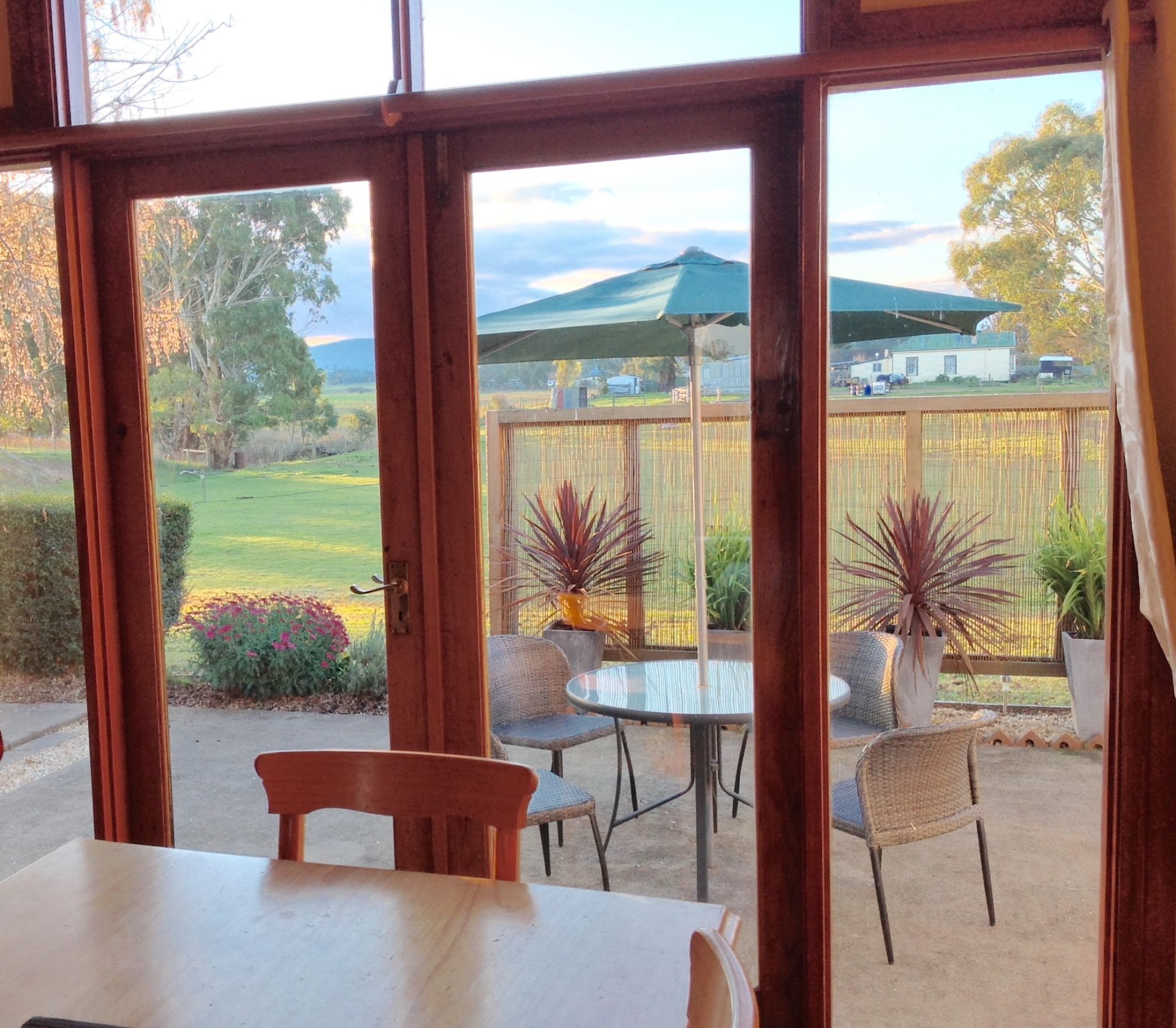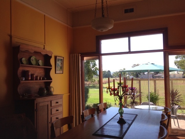 The lounge room is very cozy with a large wood-fired heater. The dining room is simply a lovely bright room, north facing aspect and extends through french doors to a large outdoor patio entertaining area that overlooks fabulous rural and mountain views.