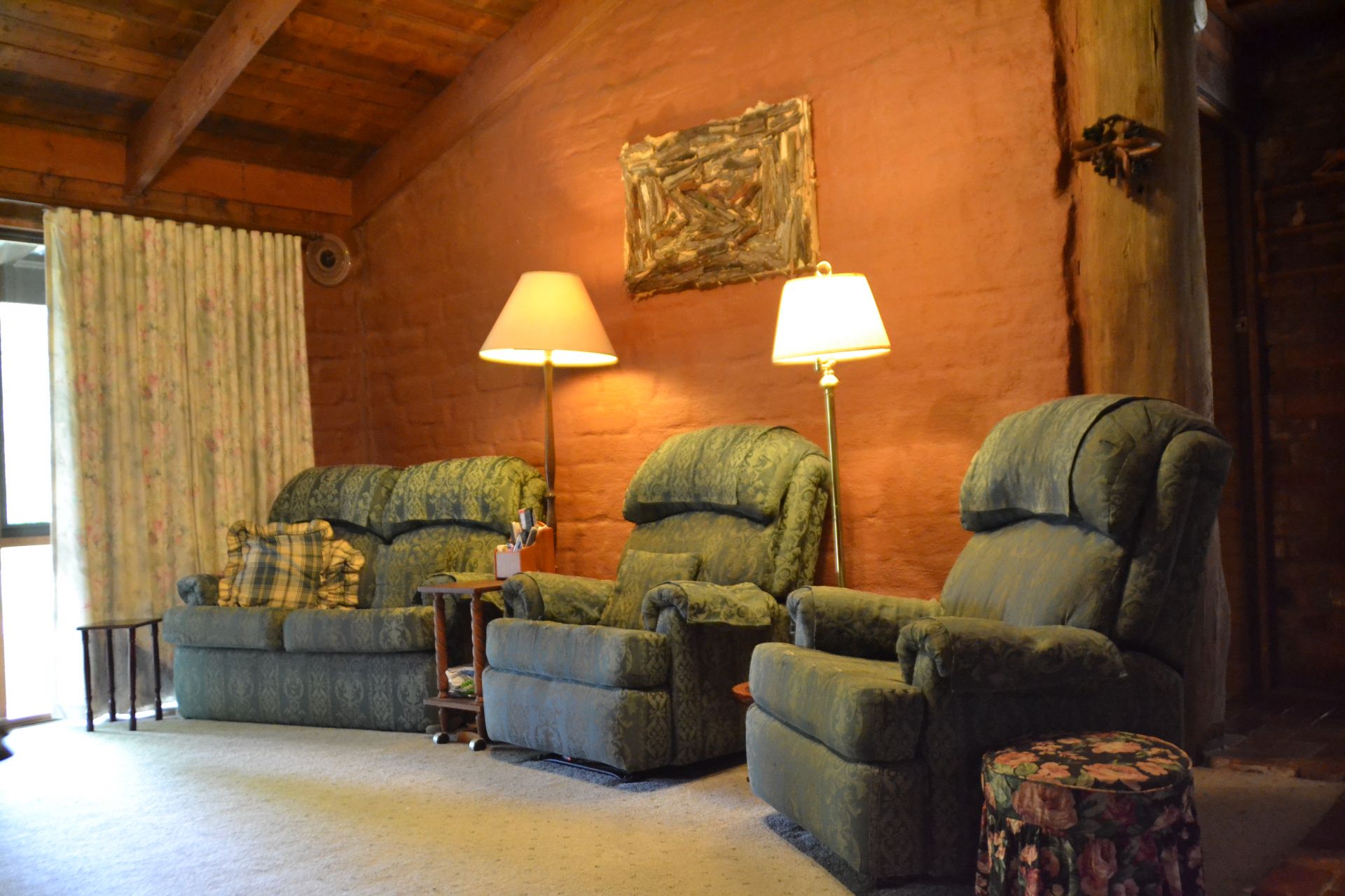 Open family / dining area includes a rustic bar and old power poles as main structural supports.