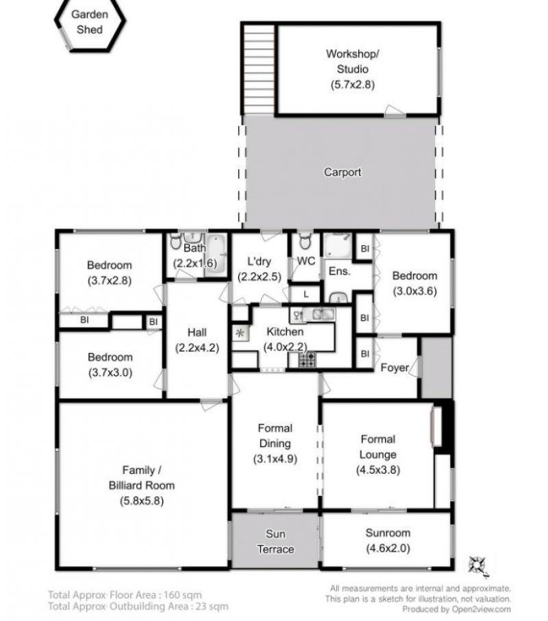 There is an adjoining workshop connected to the home by a carport as well as a BBQ area area that traps the sun.