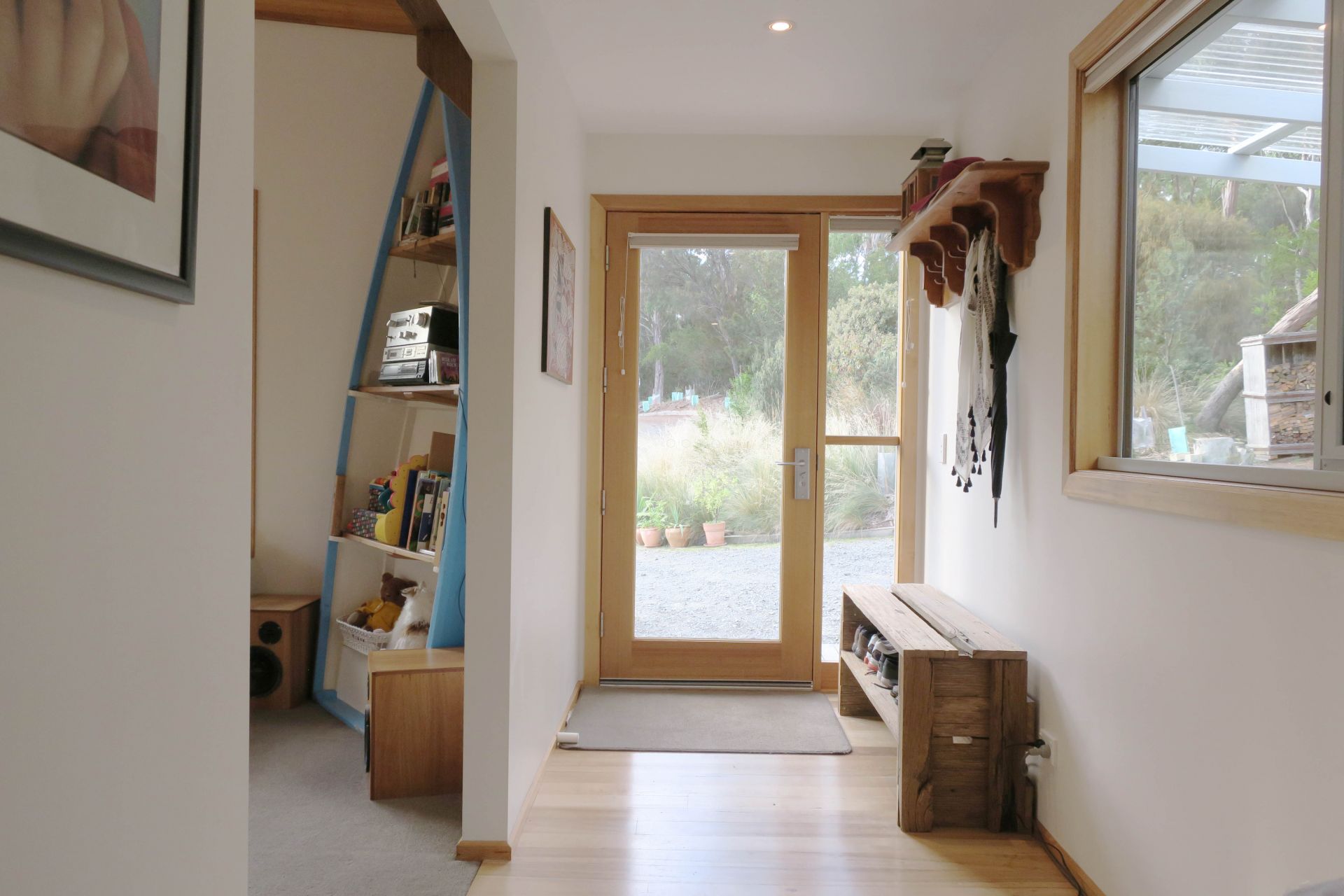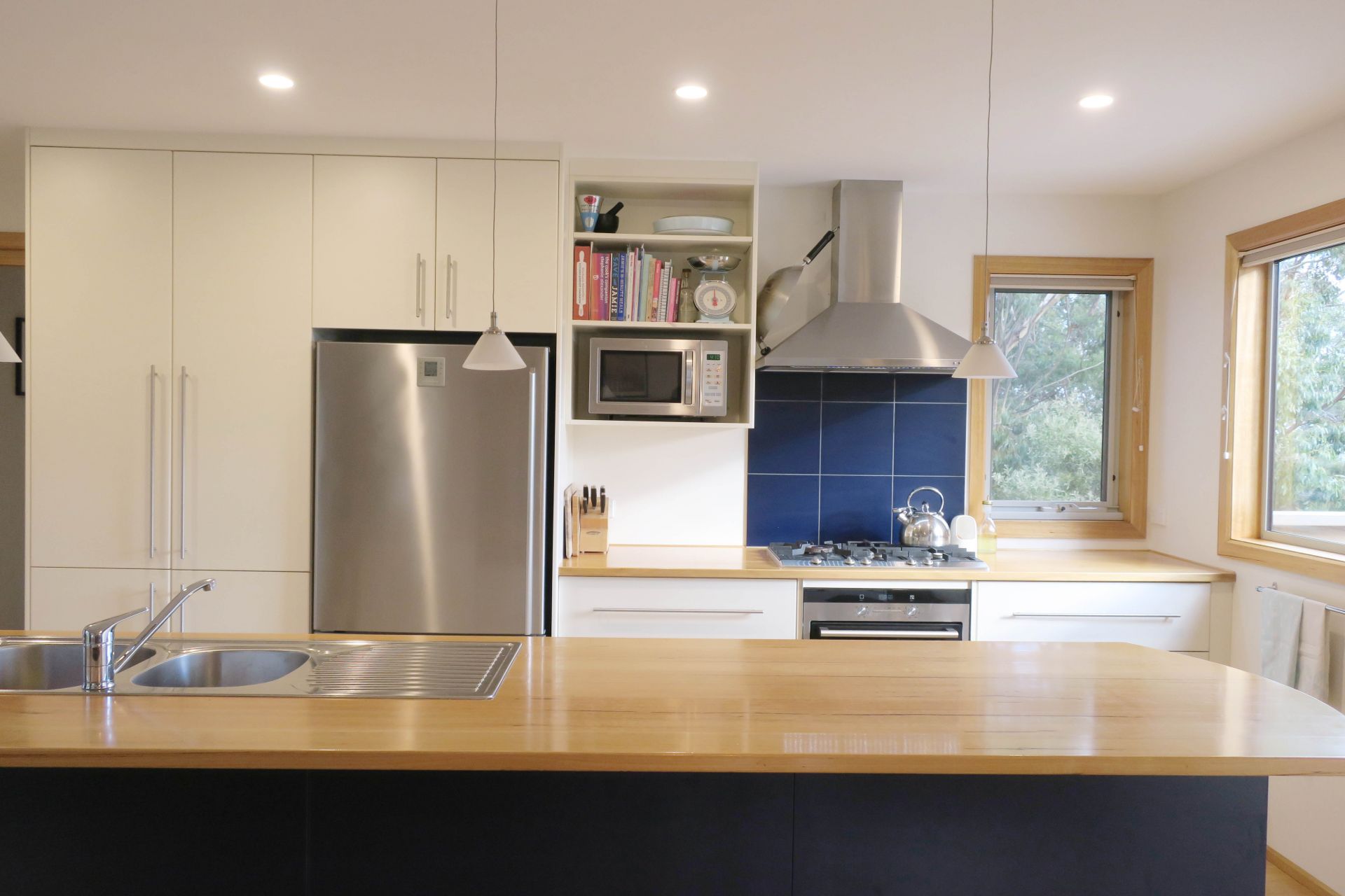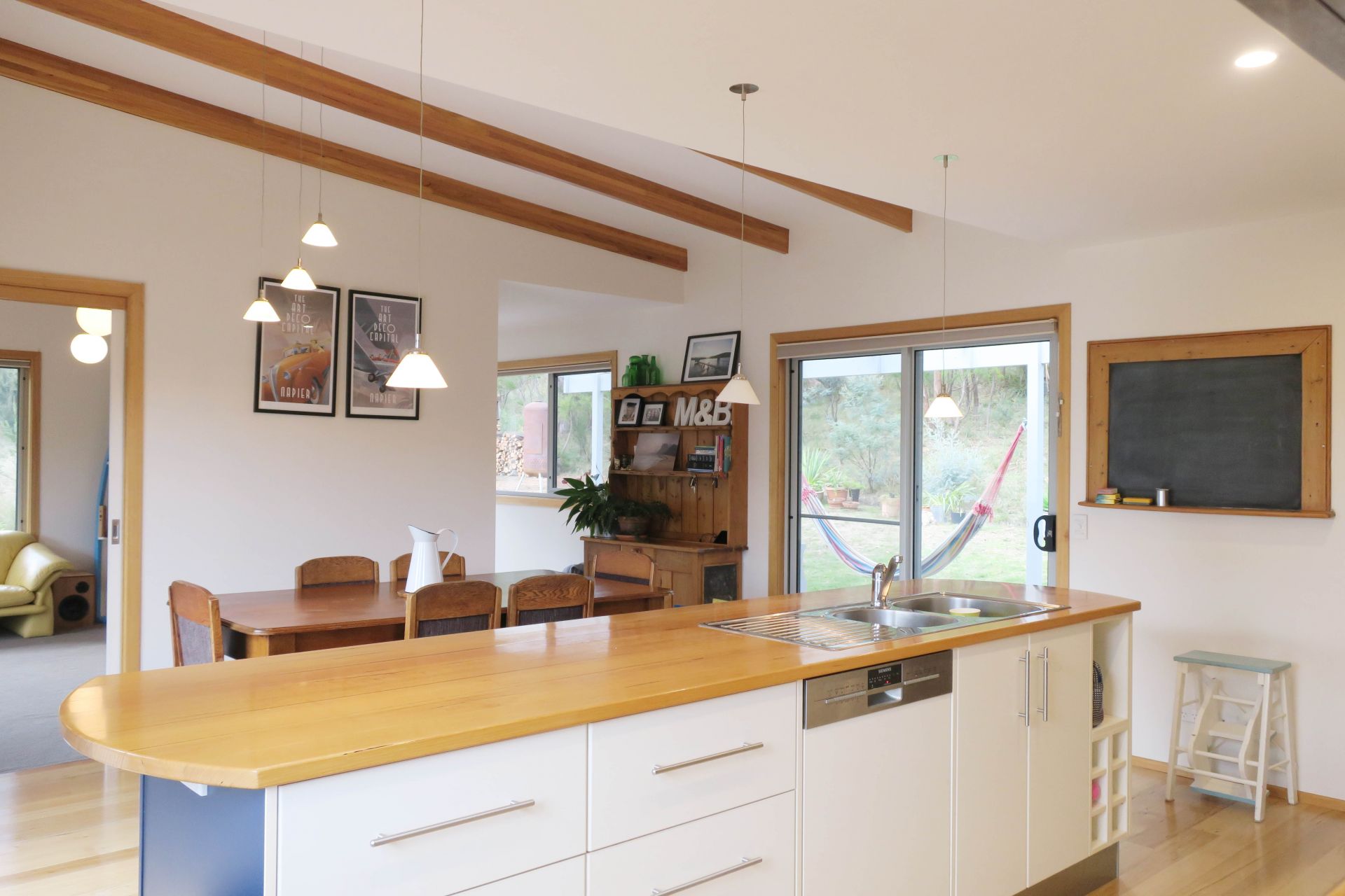 - Beautiful timber details, including raked ceilings with exposed rafters, solid timber floors and trims, and Tas oak counter tops