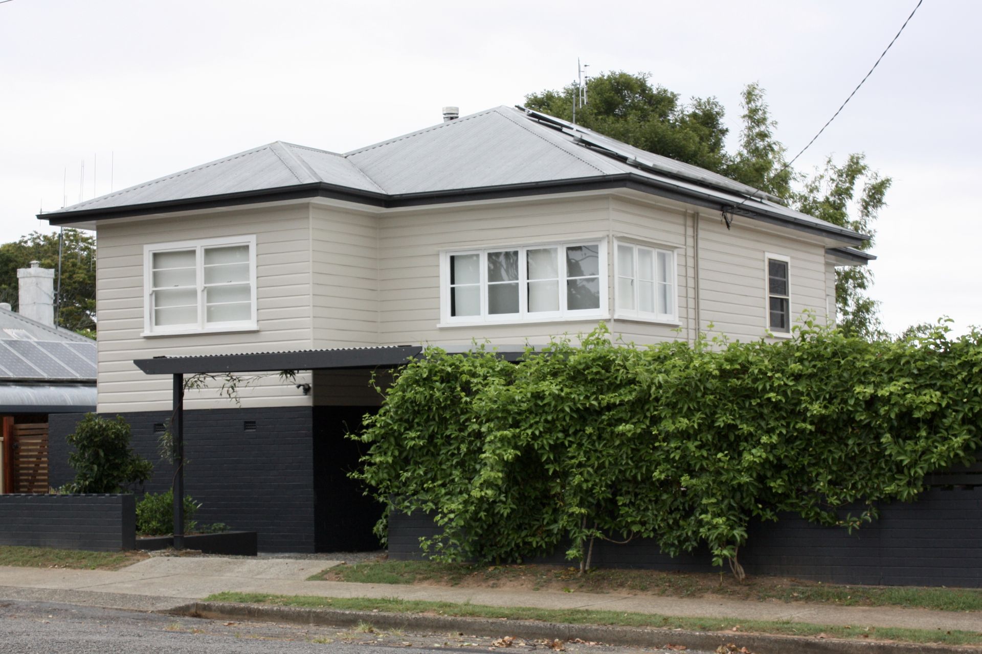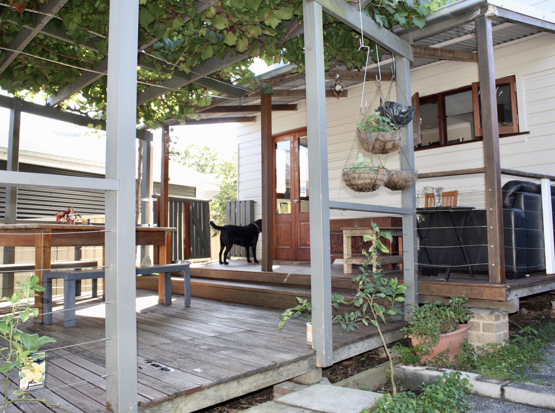 The timber deck and pergola (covered with ornamental grape vine) is a split level entertaining area featuring a wood fire pizza oven. This compact but practical back garden requires very little maintenance. This space includes raised kitchen gardens, young macadamia tree and fig tree, various citrus trees espaliered along the deck. It even has a free range chook pen for daily fresh organic eggs!