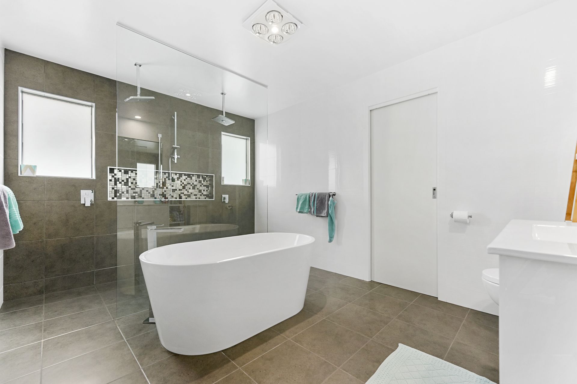 The large dual access bathroom features a double walk in shower and free standing bath. The home runs on gas heated hot water.