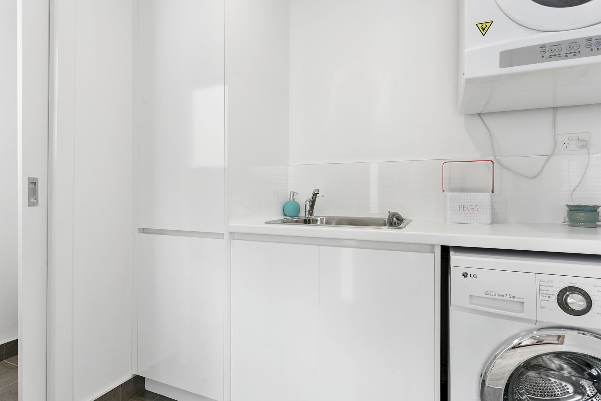 The stylish laundry also houses a second toilet, which can be conveniently accessed from the deck.