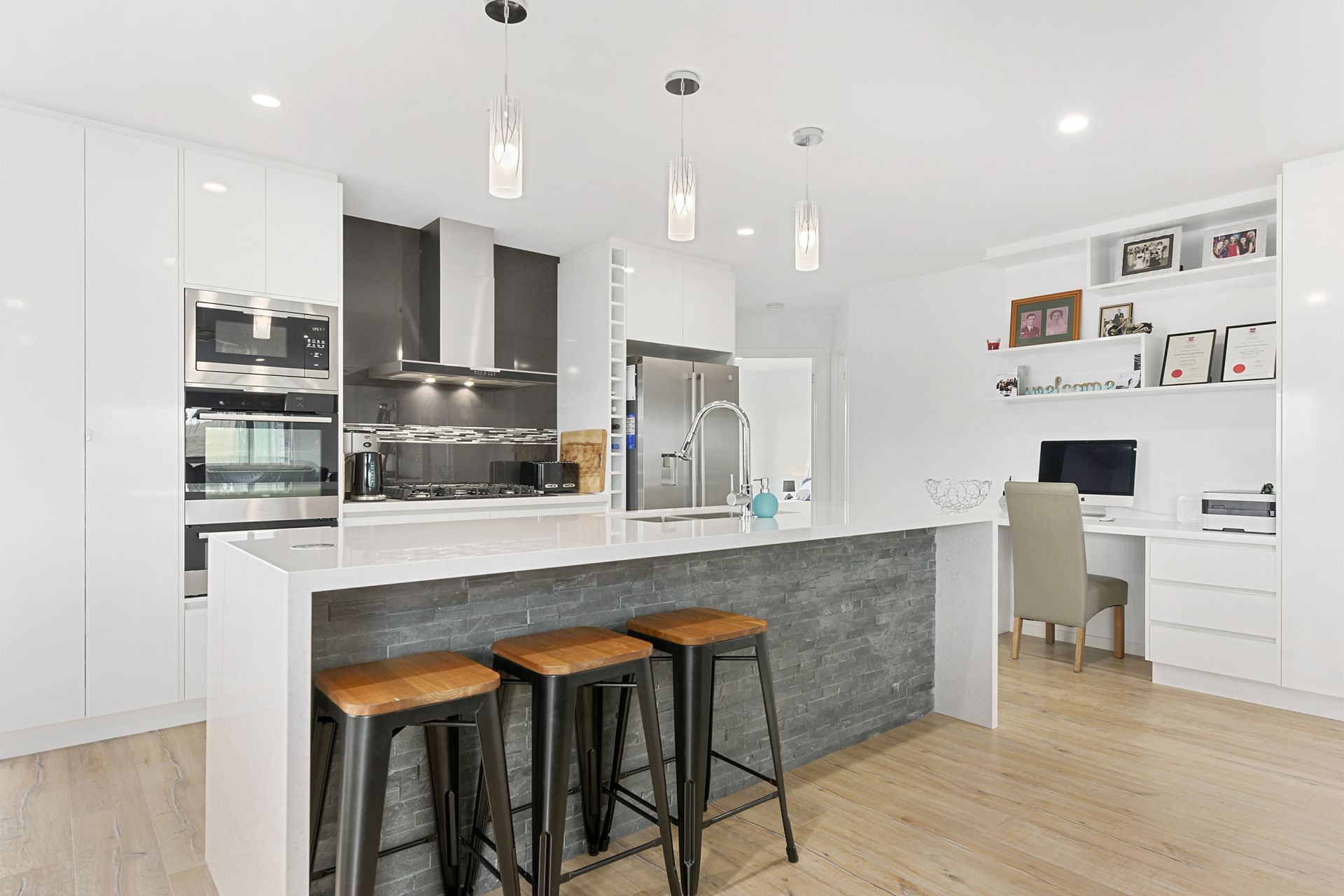 Adjacent to the kitchen is a modern study nook, complete with shelving, drawers and more storage space.