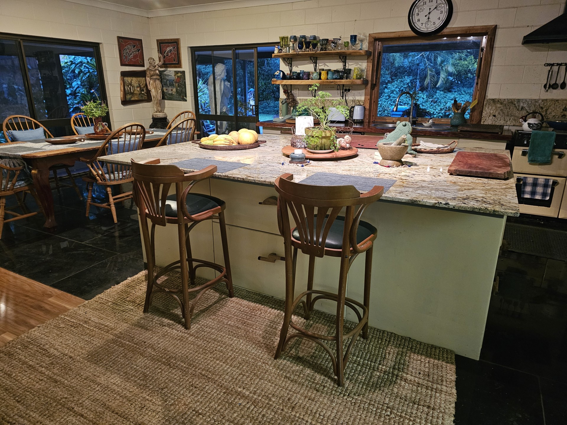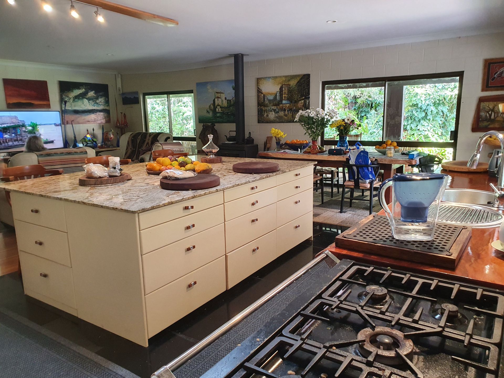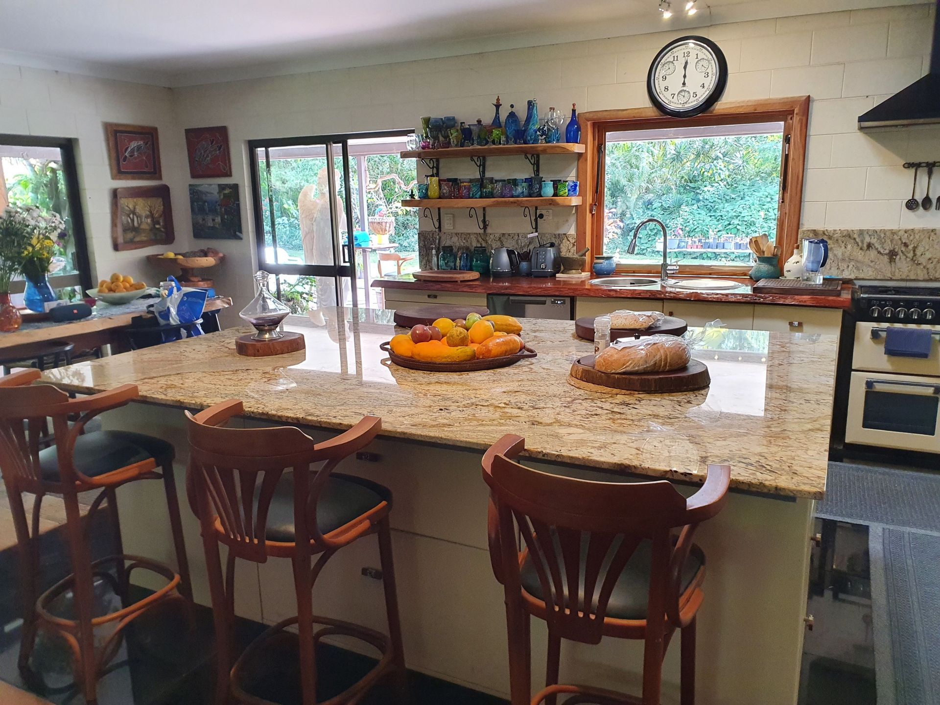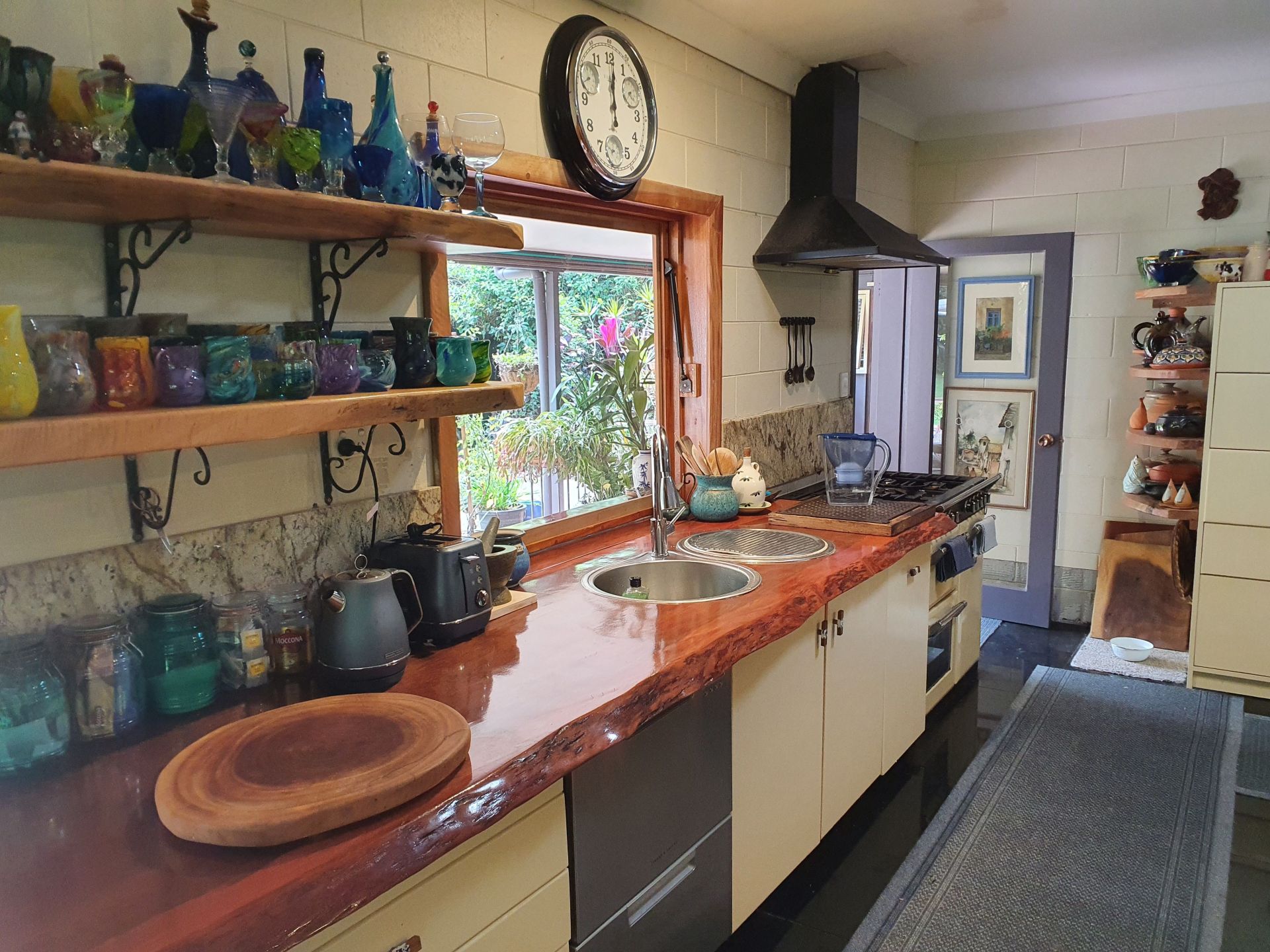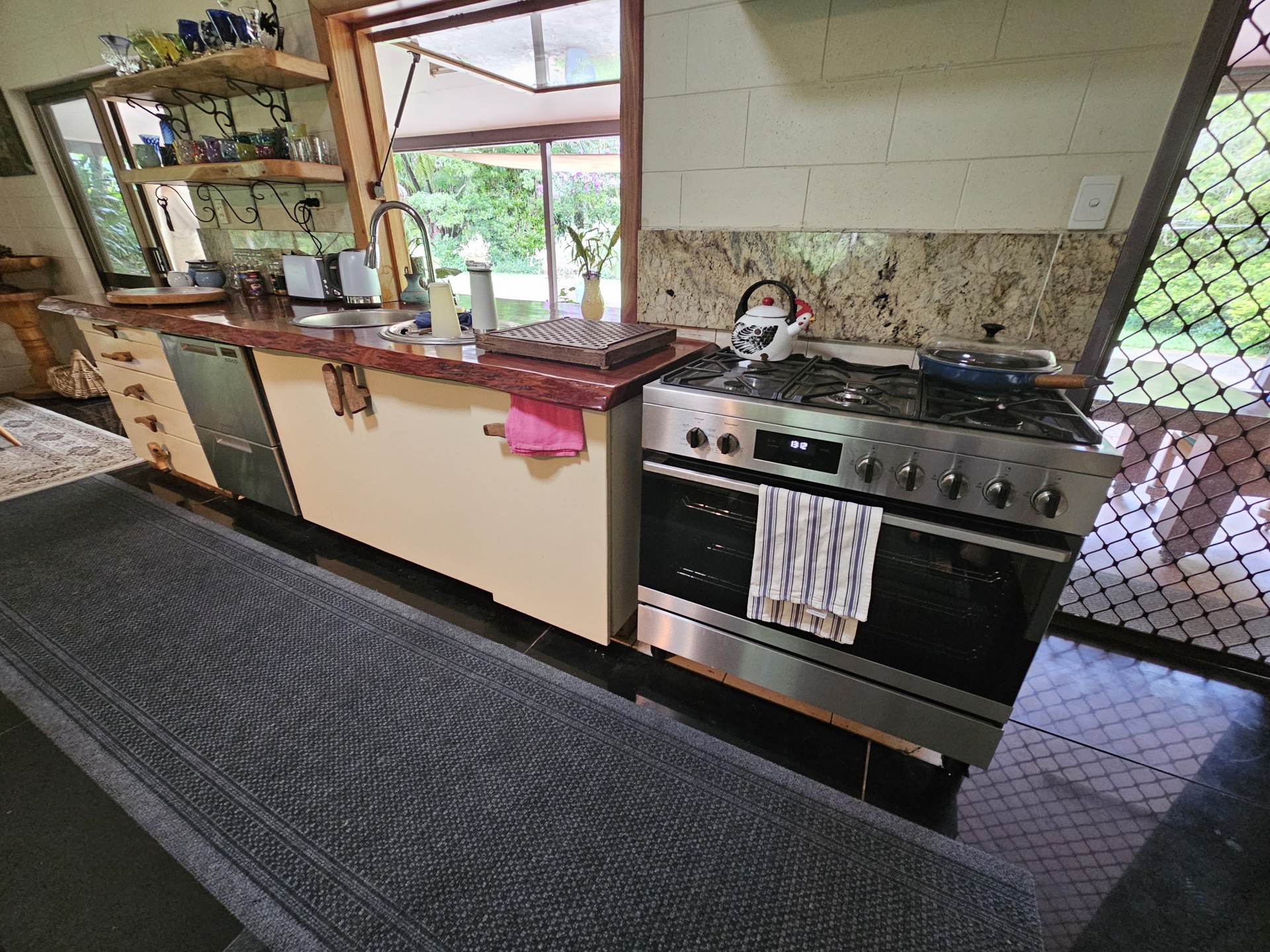 Renovated low set block home with 200m2 surround verandah. All rooms have private garden views and sliding doors with access onto the verandah. Master with floor to ceiling built-in closet and ensuite, two other bedrooms, one with built-in closet, large main bathroom and separate toilet. Large utility/laundry room and a large walk-in pantry. Custom built solid timber kitchen with granite island, awning window onto the verandah, twin Oliveri round sinks, Belling gas/electric range and granite tiles. Open plan living area with combustion wood stove. Floating timber laminate floors throughout. Instantaneous gas hot water system with rainwater tank. Large paved outdoor entertaining area with paved pathways to the studio/workshop, guest cottage and driveway.