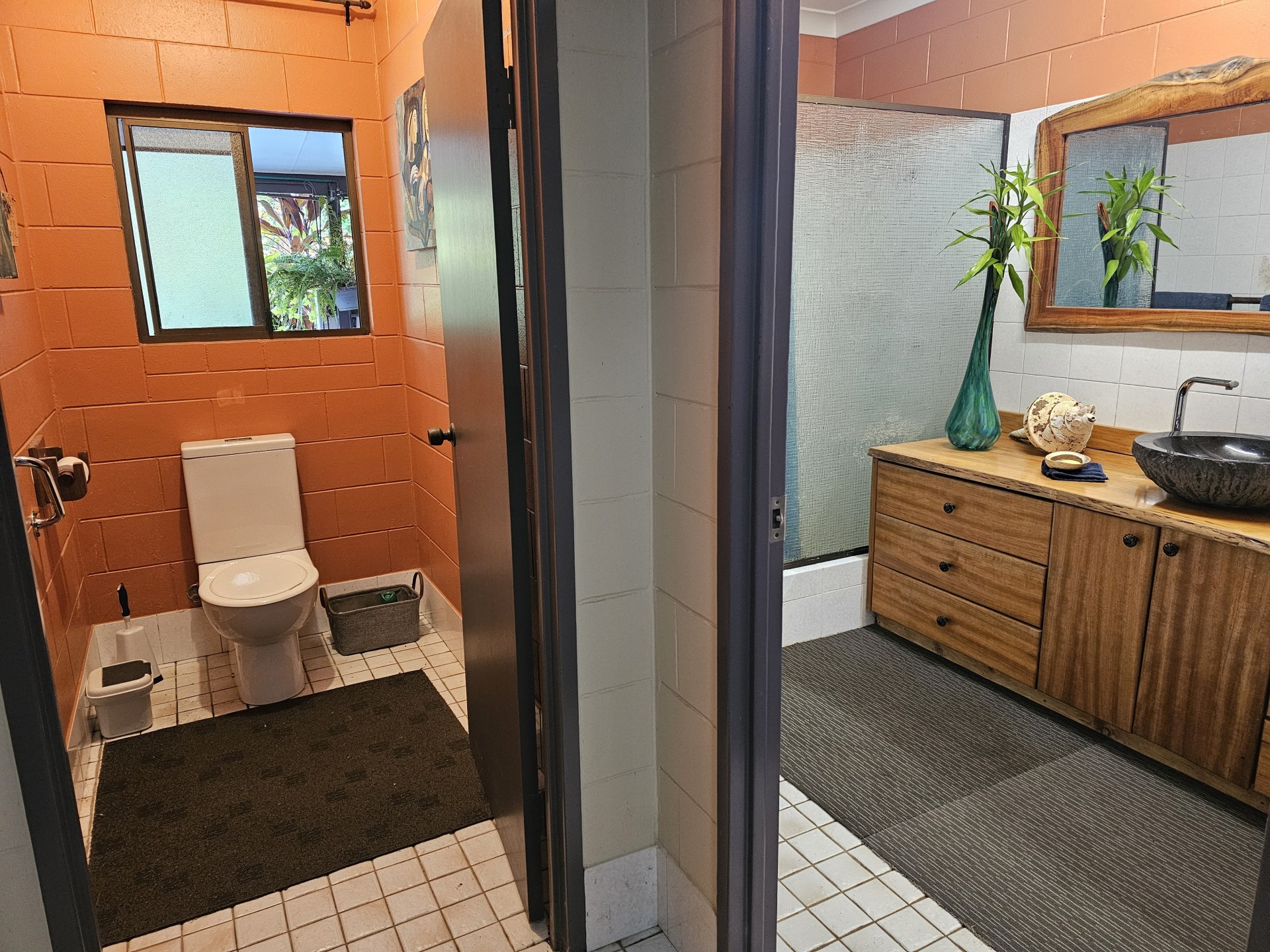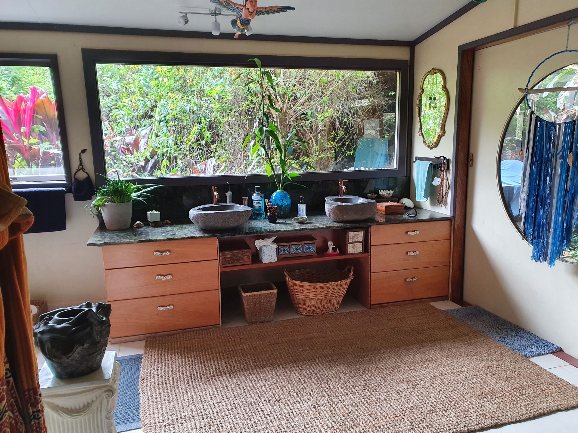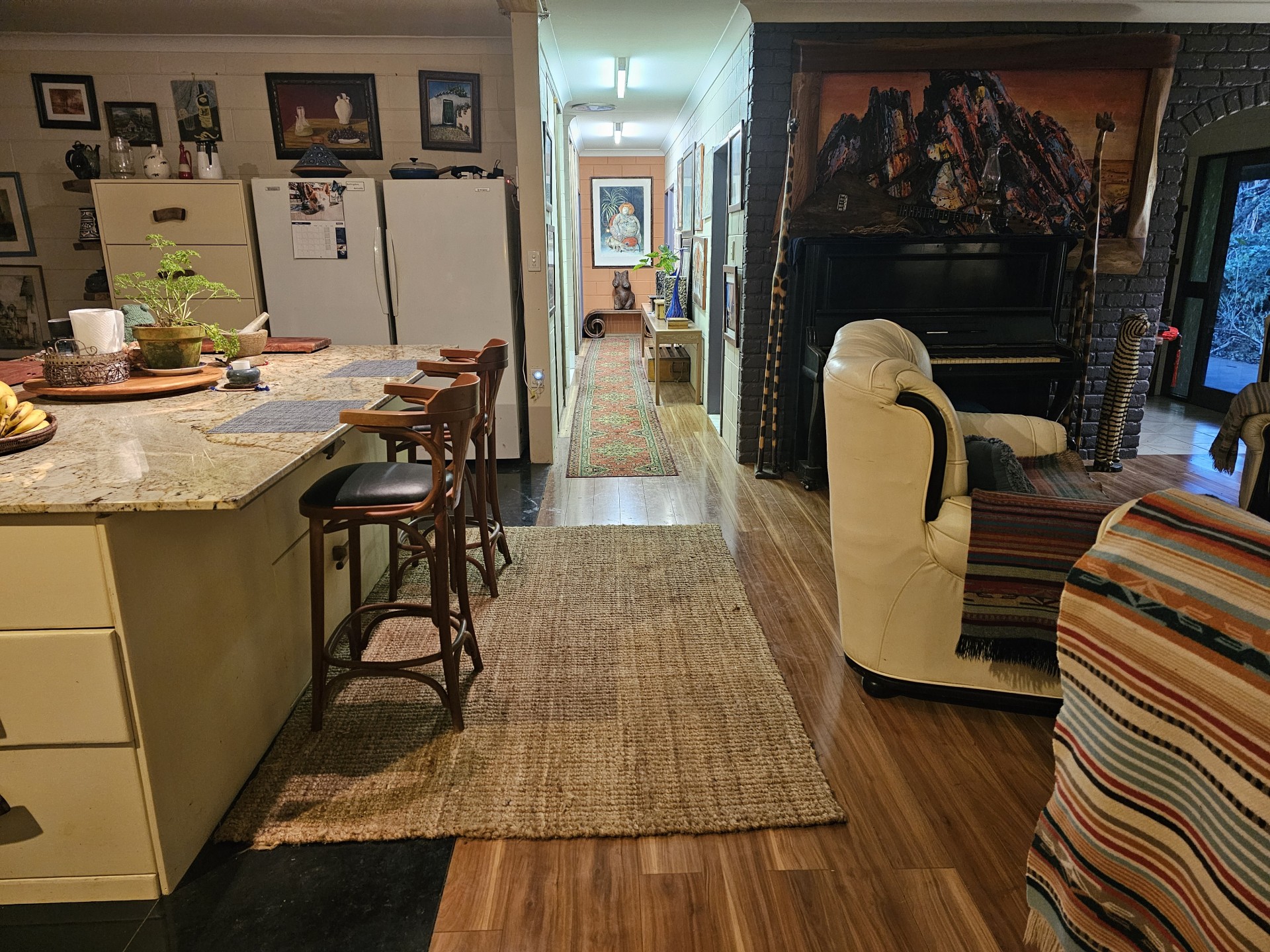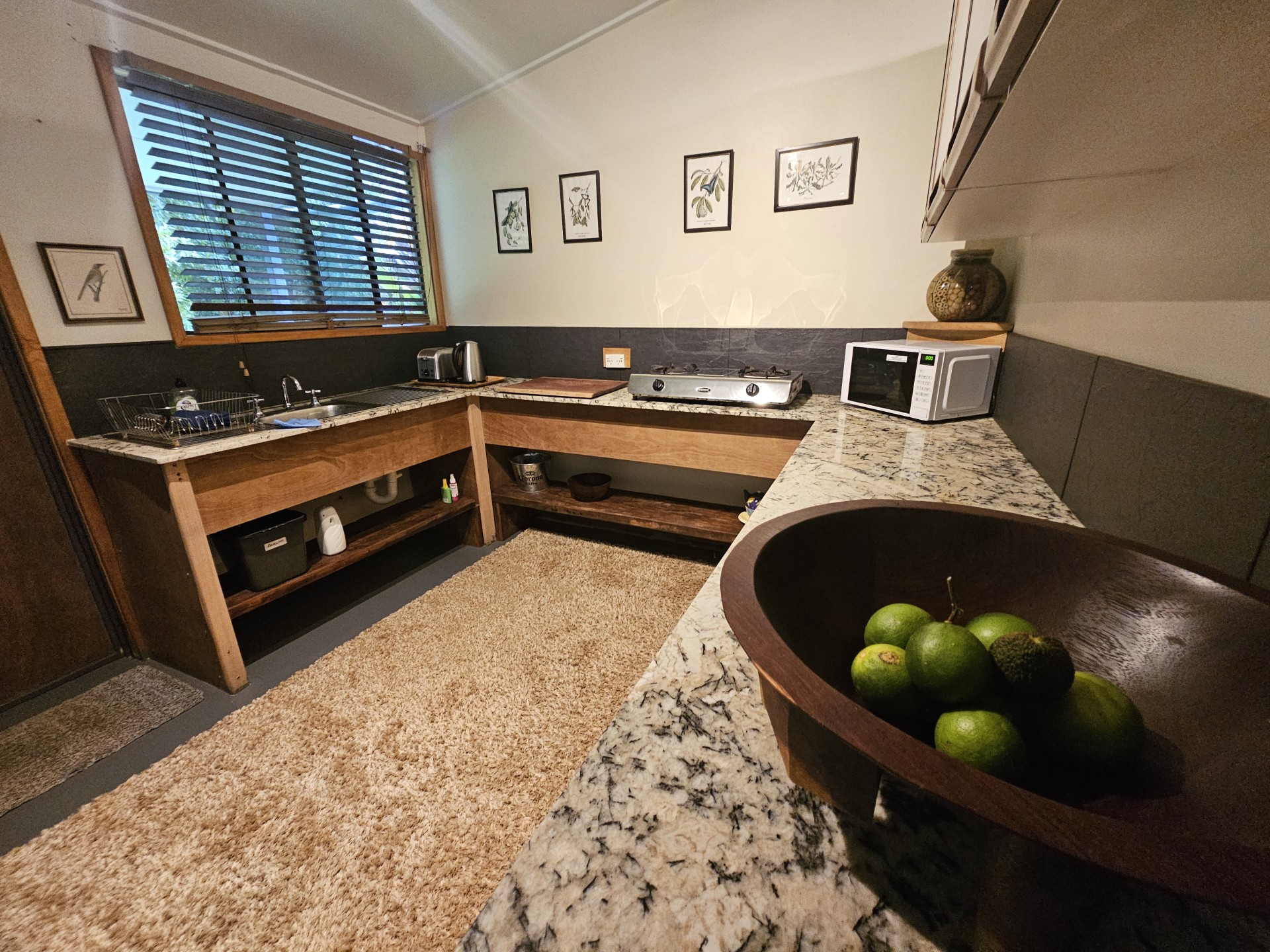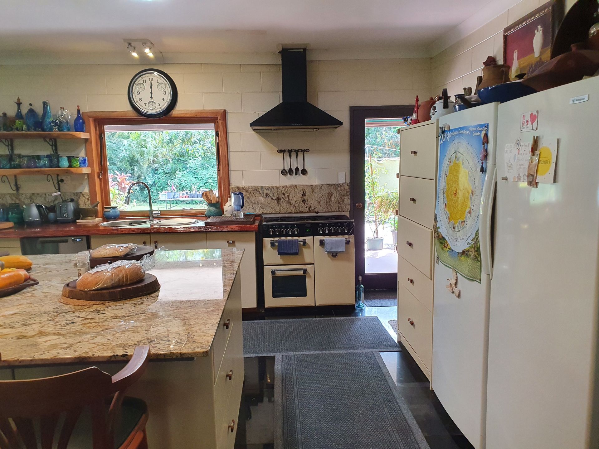Renovated low set block home with 200m2 surround verandah. All rooms have private garden views and sliding doors with access onto the verandah. Master with floor to ceiling built-in closet and ensuite, two other bedrooms, one with built-in closet, large main bathroom and separate toilet. Large utility/laundry room and a large walk-in pantry. Custom built solid timber kitchen with granite island, awning window onto the verandah, twin Oliveri round sinks, Belling gas/electric range and granite tiles. Open plan living area with combustion wood stove. Floating timber laminate floors throughout. Instantaneous gas hot water system with rainwater tank. Large paved outdoor entertaining area with paved pathways to the studio/workshop, guest cottage and driveway.