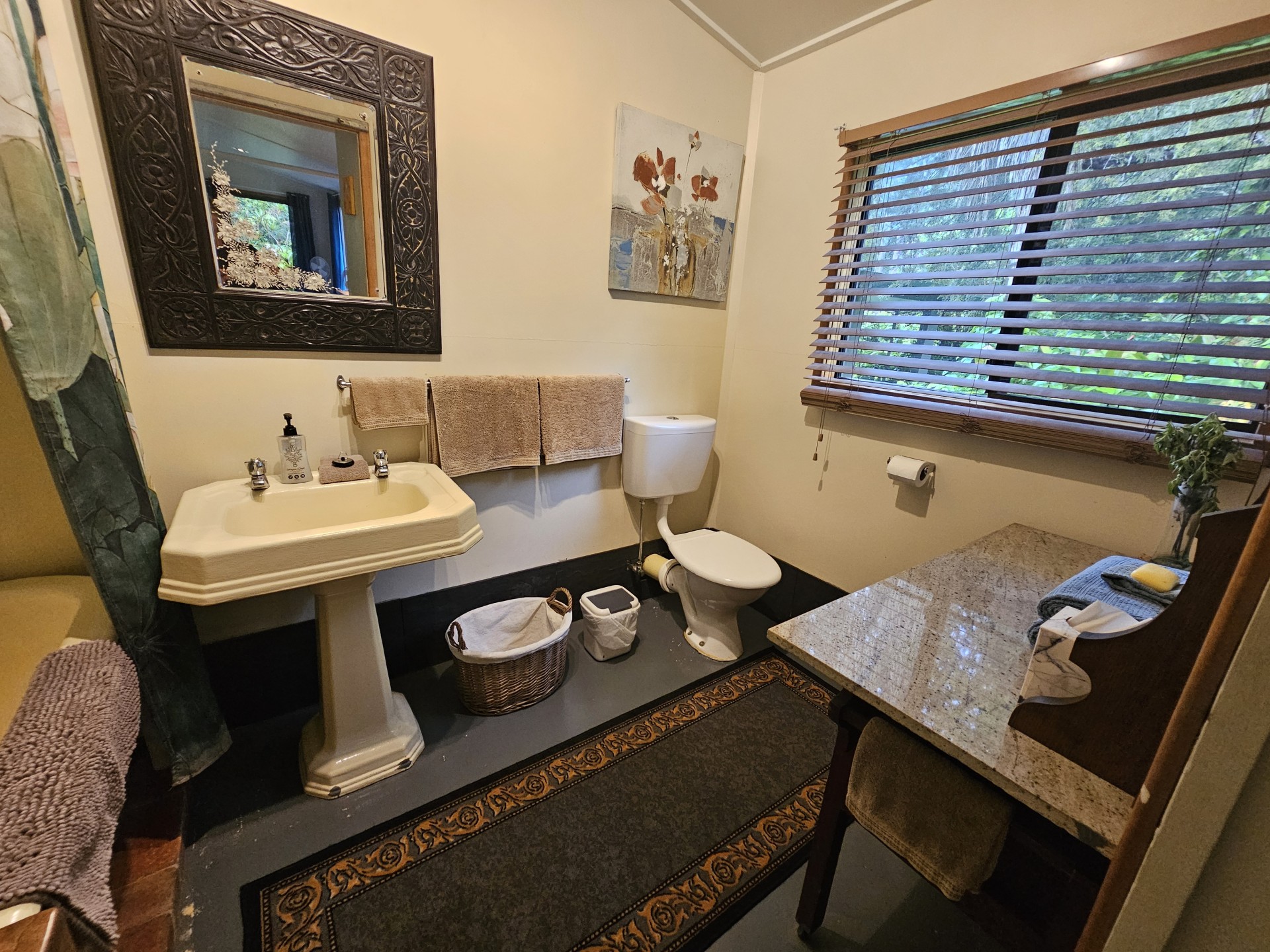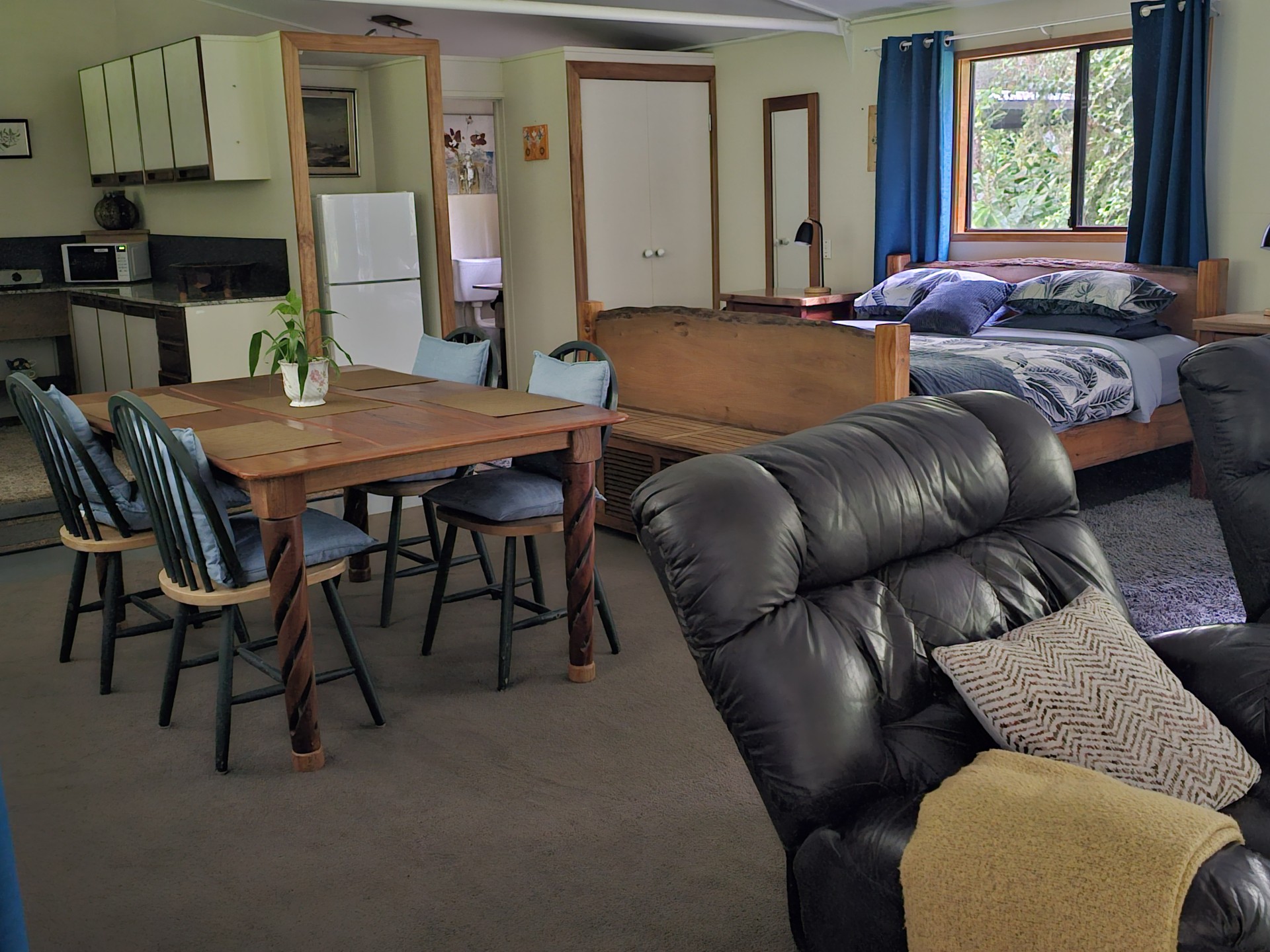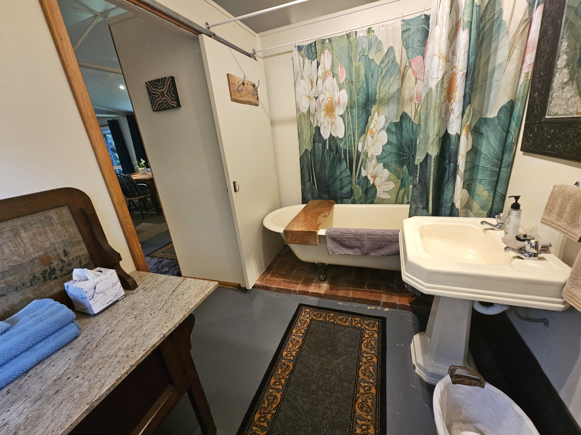 Detached Granny Flat/studio apartment (74 m2), spacious and self-contained with private garden views. Kitchenette and antique wood-fired stove. Bathroom with antique clawfoot bath/shower. Private access from the driveway. Currently has king bed and sofa bed, sleeping four. Established holiday listing with three years of booking records and three guest review awards.
