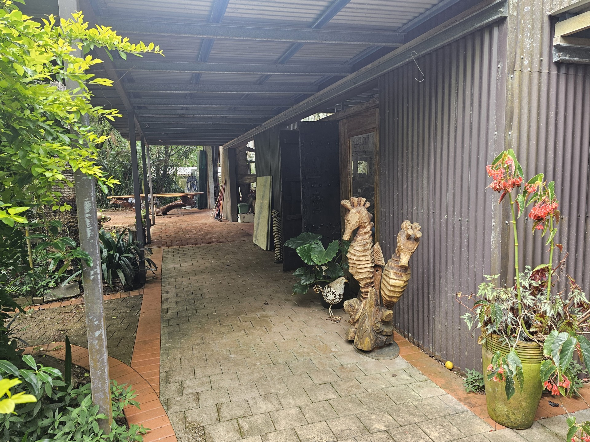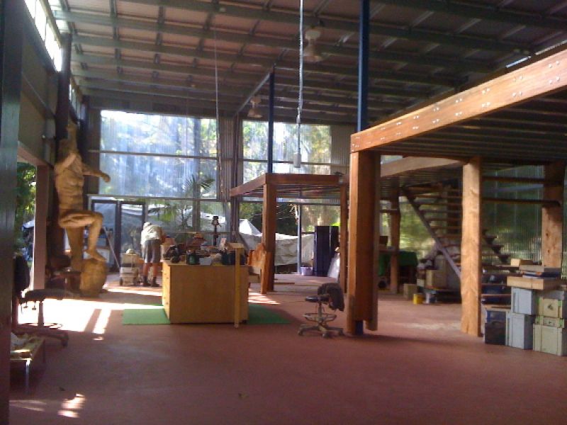 Studio/workshop is 18m x 9m (162 m2) with 5m high roof and two 6m x 4.5m mezzanine levels. Floor to ceiling laser lite walls for natural light. Surrounded by gardens and hedges so screened from the house. Separate fuse box with full lighting. Large undercover, paved parking area/loading bay.