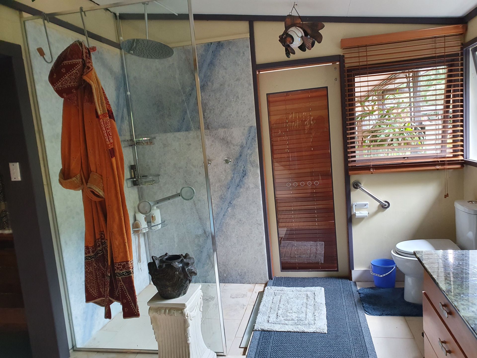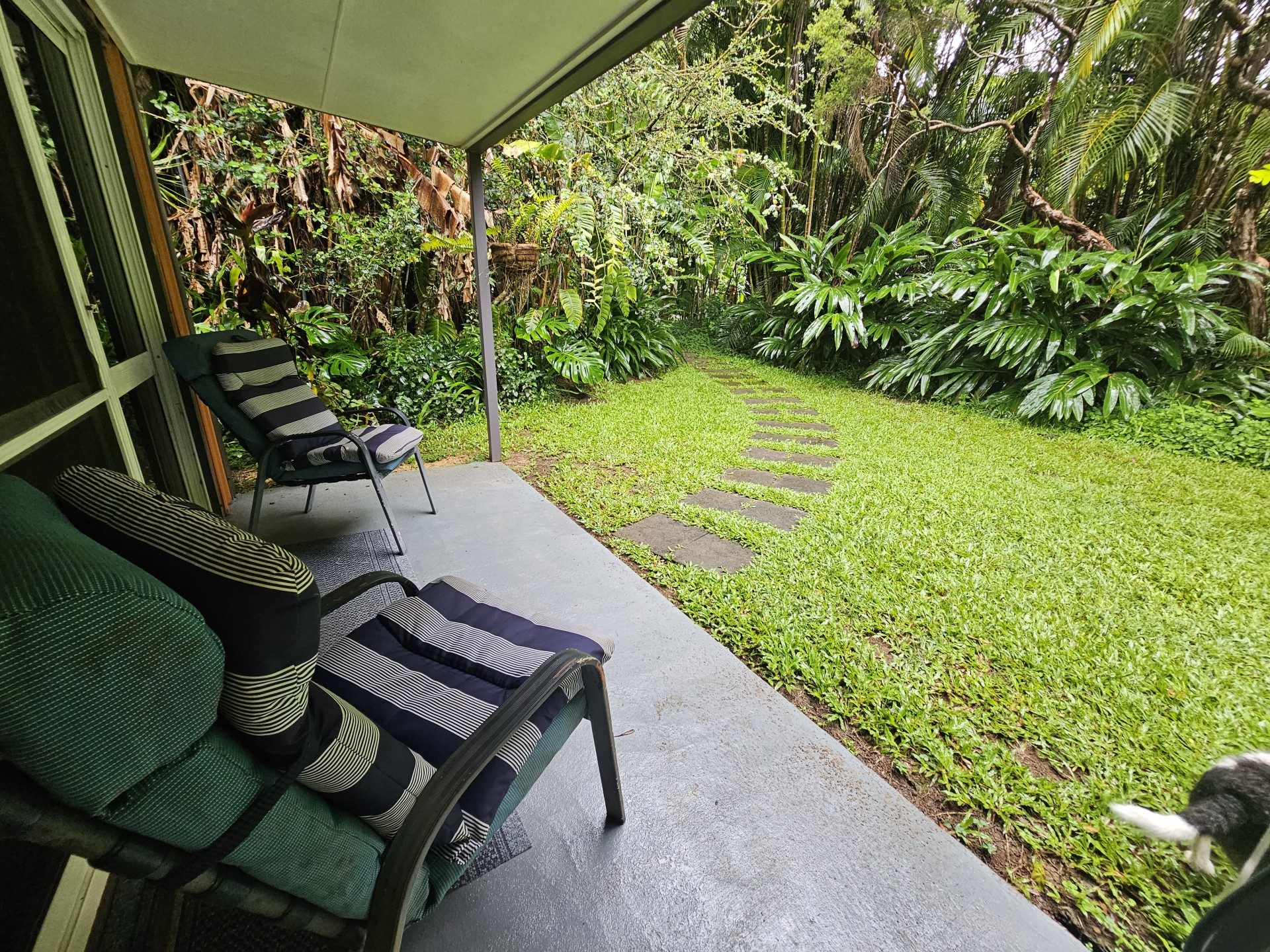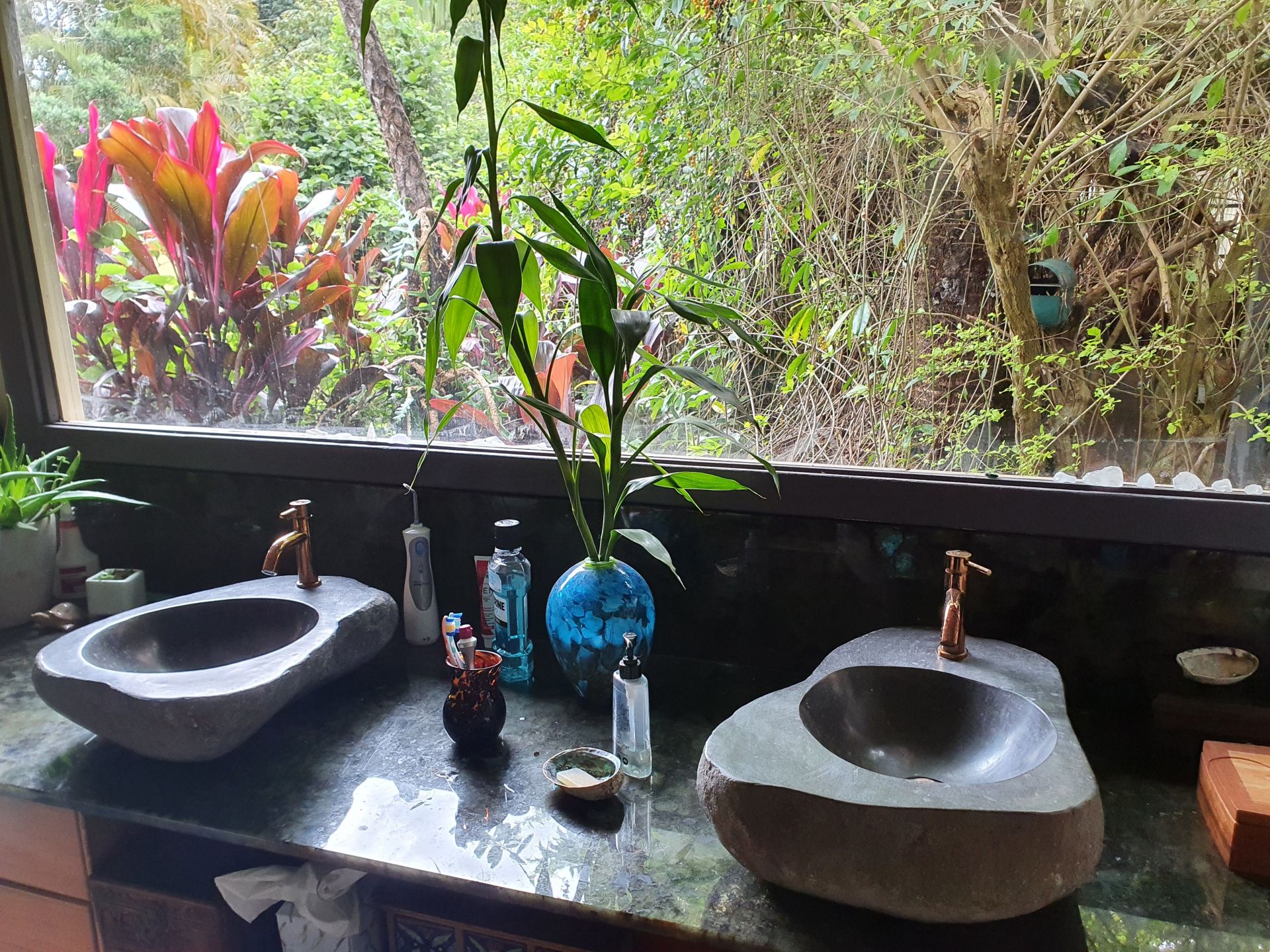 The garden has a range of established trees (35 years) including Norfolk Pines, Jacaranda, Liquid Amber, Silky Oak, Poinciana, Flame Tree, Quondong and other native rainforest species. A vast array of flowering plants including native heliconias, gingers and orchids as well as camellias, azaleas and flowering vines.