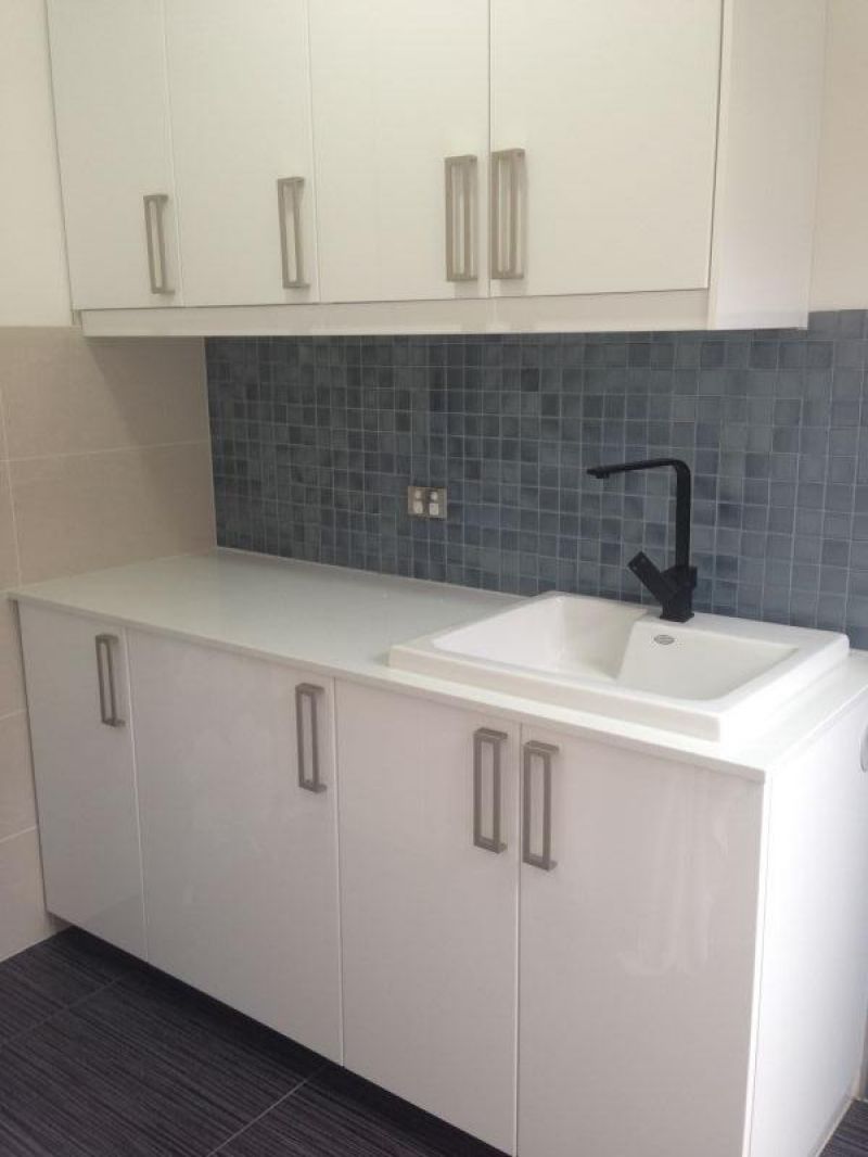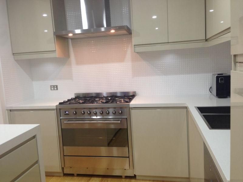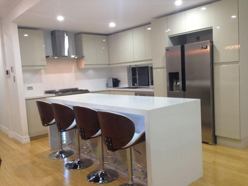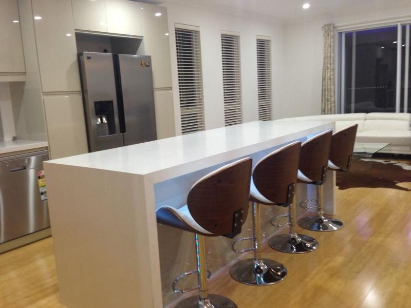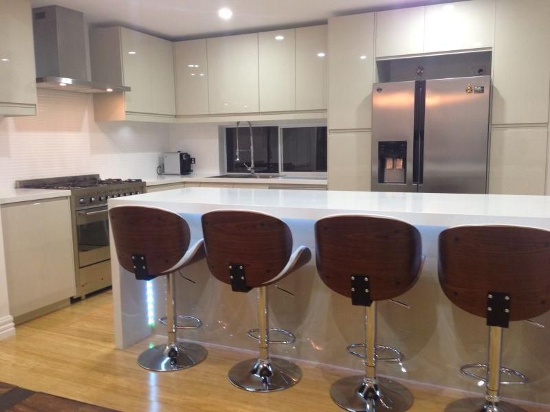 The huge kitchen offers high-gloss doors, stone bench tops, built-in microwave,dishwasher, 900mm free-standing Smeg oven, huge Island bar with Ceasarstone top and waterfalls on both sides, soft-close doors and drawers, and Spanish-tile splash-back.