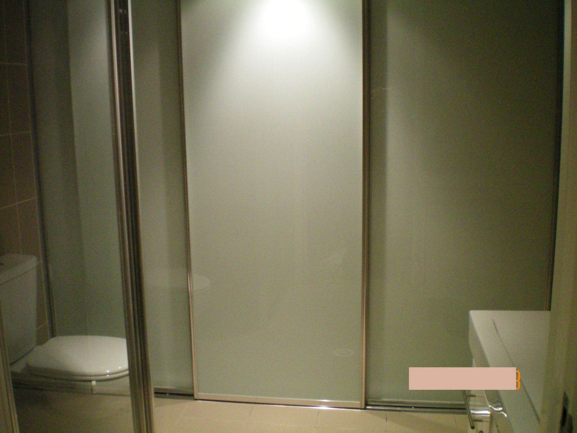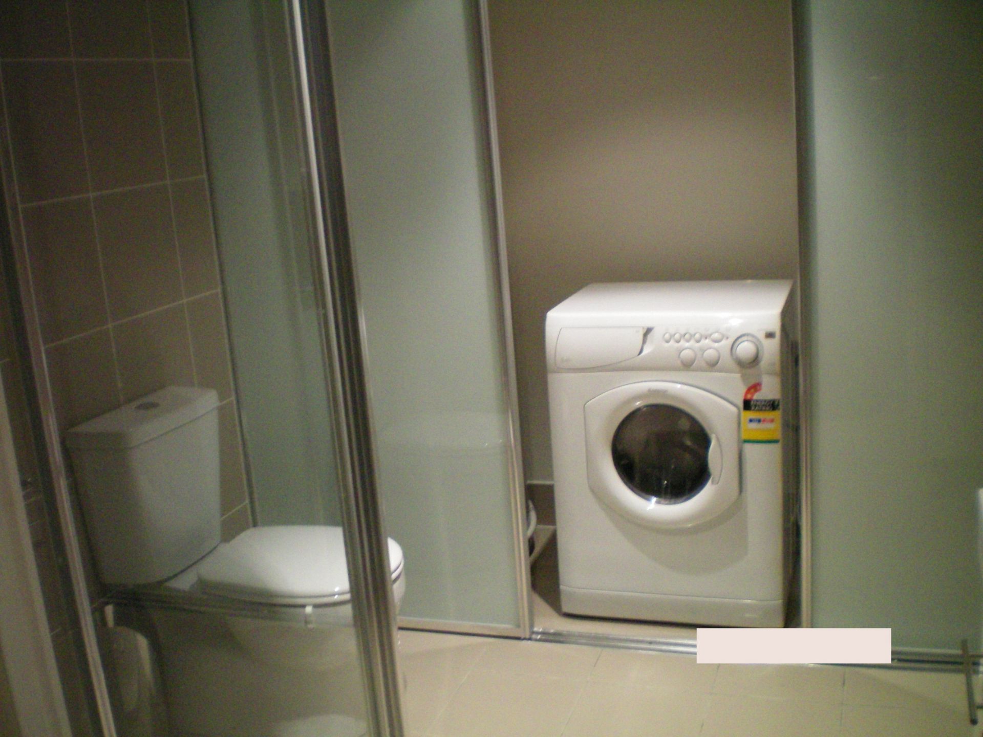 Modern Tiled bathroom, with European laundry adding a touch of class, behind fostered sliding glass doors.