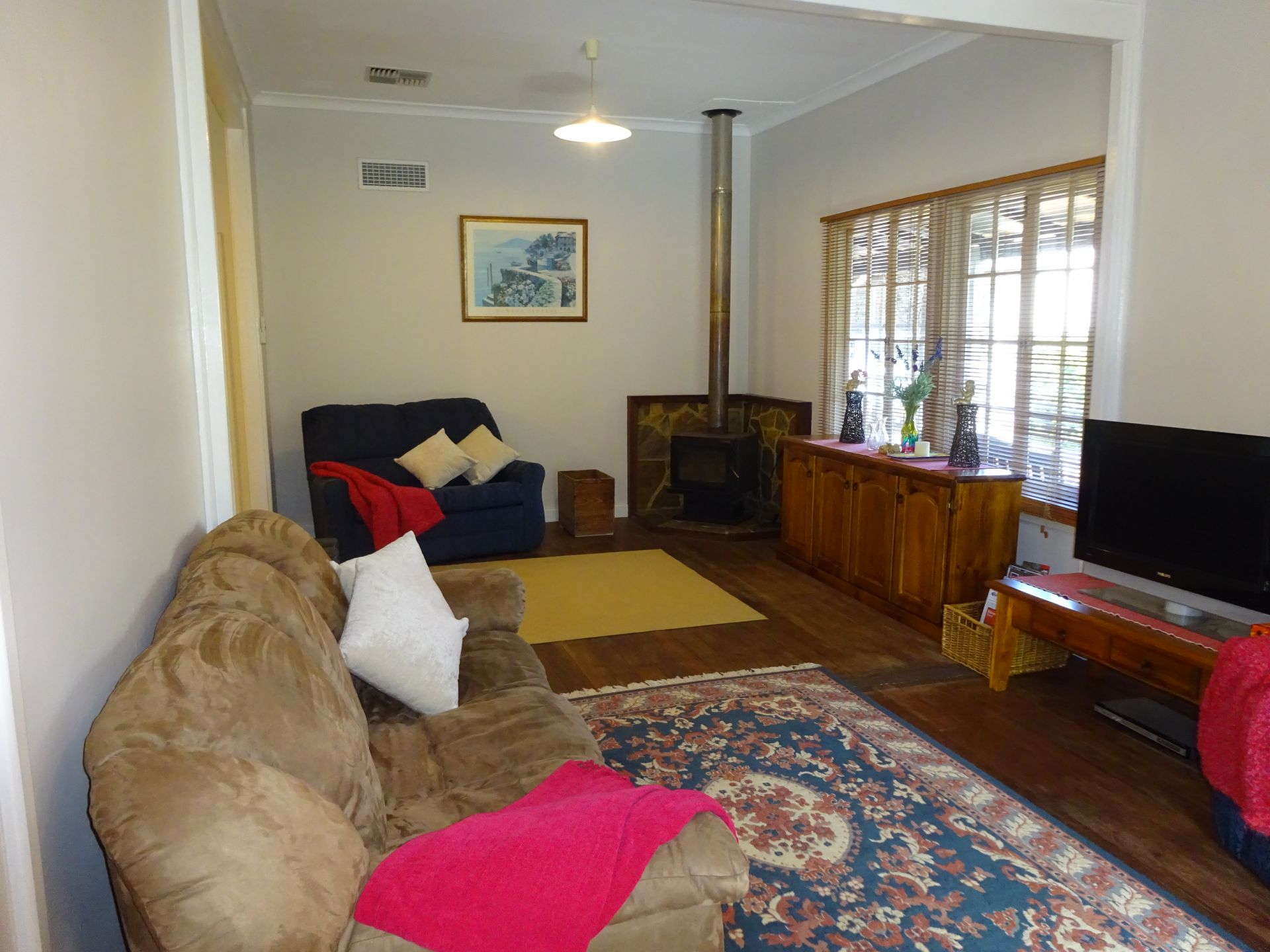 This home has open plan kitchen and lounge rooms with high ceilings. The kitchen has a freestanding gas stove on slate floor. Lounge features potbelly stove, original wooden floors and evaporative air conditioning. Large master bedroom has a high ceiling and two cosy bedrooms are all carpeted. Activity room is of a good size. Relax on the front and side verandas.