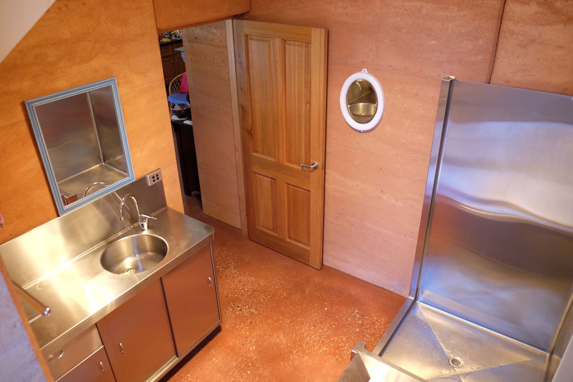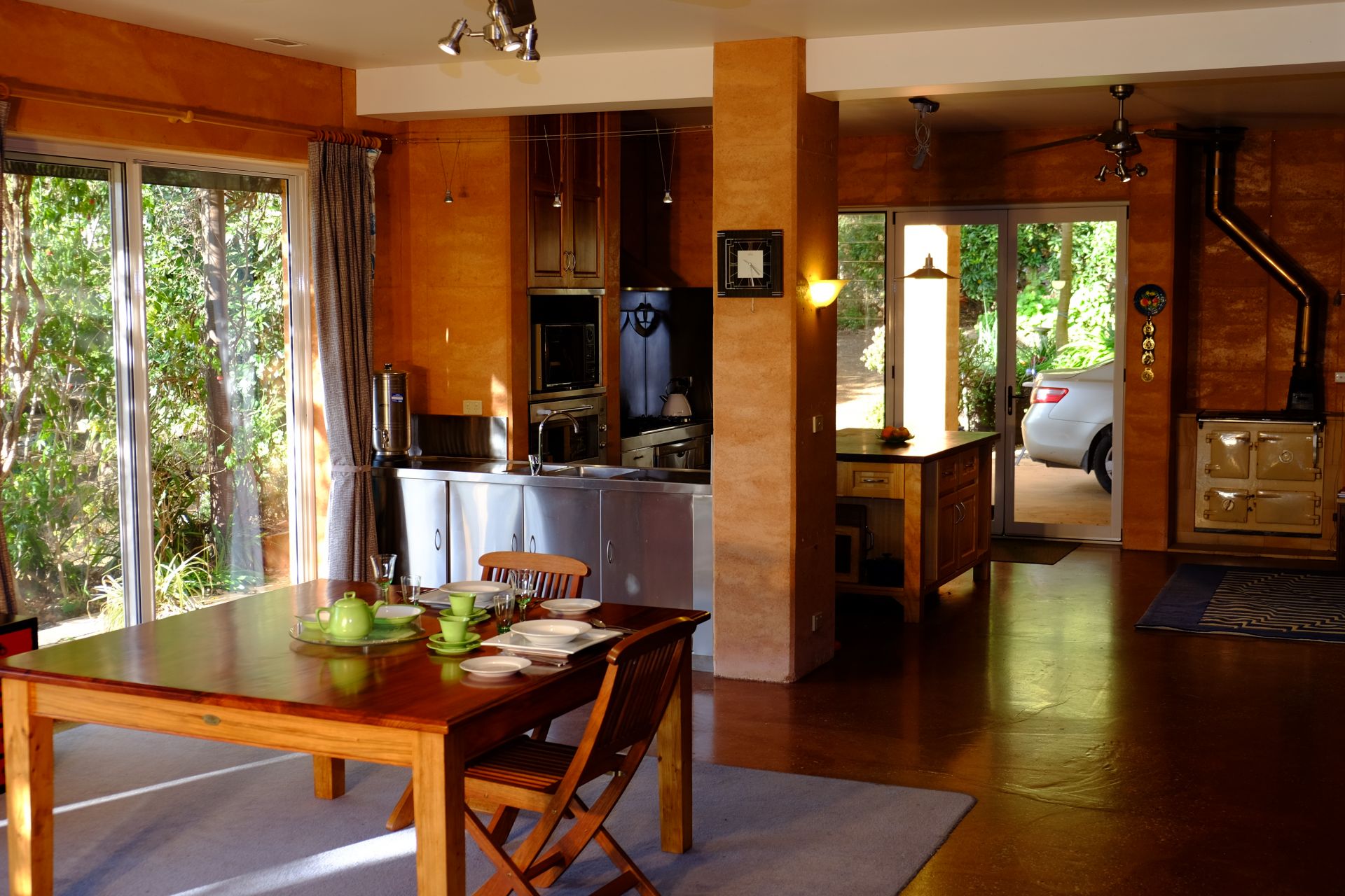 The rammed earth ground floor offers thermal mass, low maintenance and the upper floor's Hebel construction offers thermal efficiency. Along with the 10 ceiling fans, great cross flow ventilation, external awnings, external deciduous shading and two split system A/Cs make for summer comfort. North facing windows, slow combustion stove and wood heater make for winter warmth.