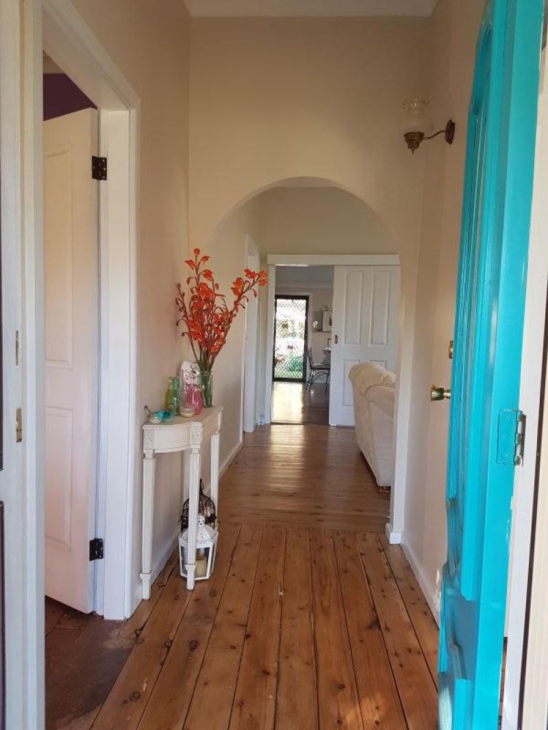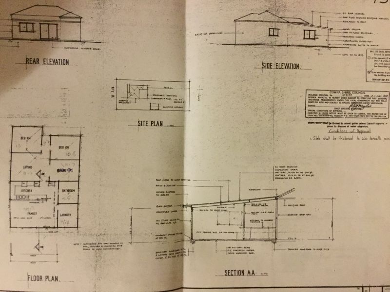 Construction is veneer cladding on front with hardiplank blended on extensions. Double bats insulation in ceilings, colorbond roofing. All rooms have bright natural light flooding in.It features beautiful Cyprus floorboards,12' ceilings, lounge room includes original cast iron fireplace & surround. 2BRs have built-in robes, all rooms have remote control ceiling fan/lights. The spacious kitchen/dining/family extensions are on concrete slab with vinyl floor covering, electric stove & range hood, abundant cupboard space & separate pantry. A slow combustion wood heater keeps ambient temperature throughout house. Reverse cycle air conditioner if necessitates in summer. Large family bathroom consists of a full bath,Laundry is spacious with 2nd shower recess.