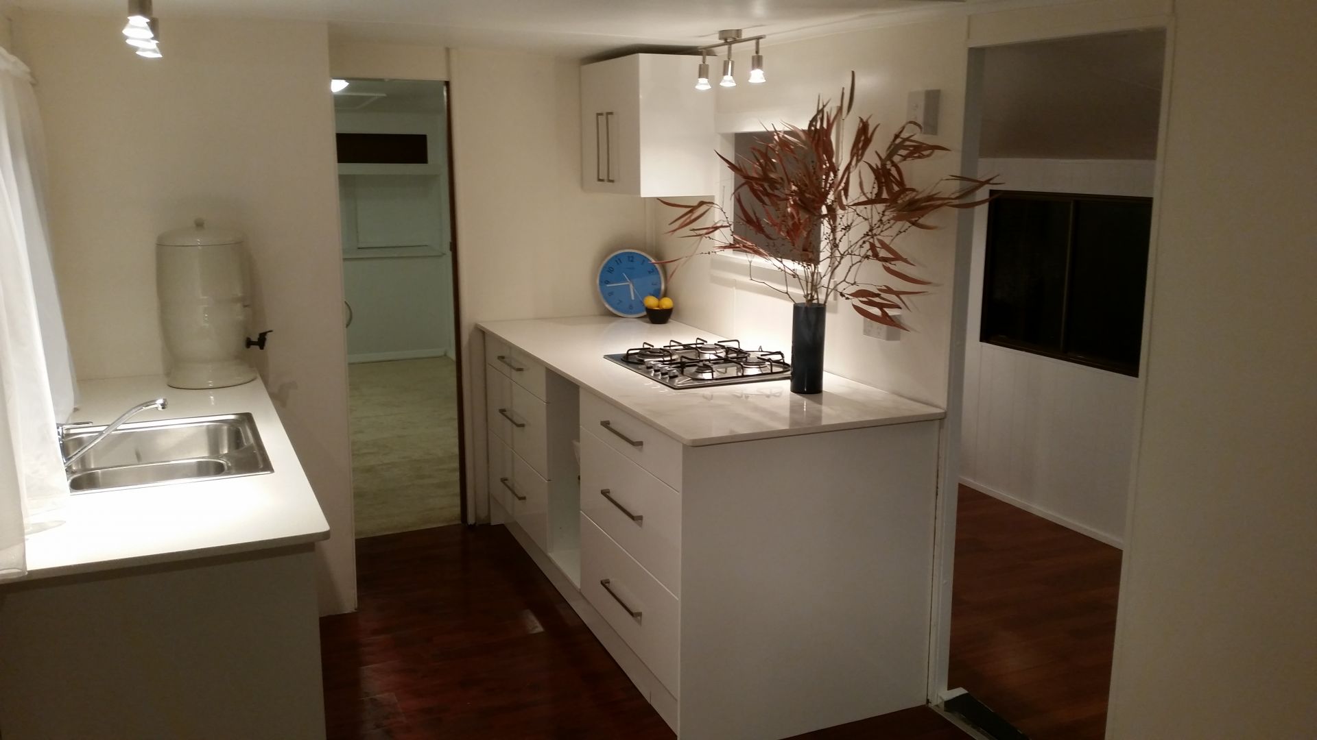 Large, beautiful new kitchen with Caesar Stone bench tops and soft self closing cupboards and drawers. 4 burner gas stove top and plenty of space in the large pantry with lovely timber flooring.