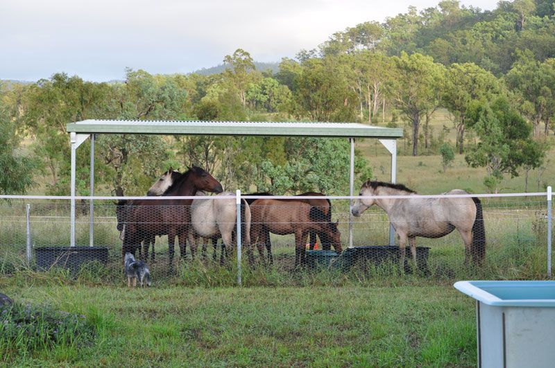 Running off from the house yard and foaling paddock is the foal raising paddock or stallion paddock. This is a 3 acre area that is fully rabbit netted using waratah galvanised star pickets and steel corner posts concreted in all offset by thick electric tape. There is a large Ranbuild 6 x 6 metre colourbond carport in this paddock for shelter for the horses. No horse will ever be able to damage this shelter. The horses love it! This paddock is also running chickens as it is completely vermin proof and would be safe for sheep or goats as well.