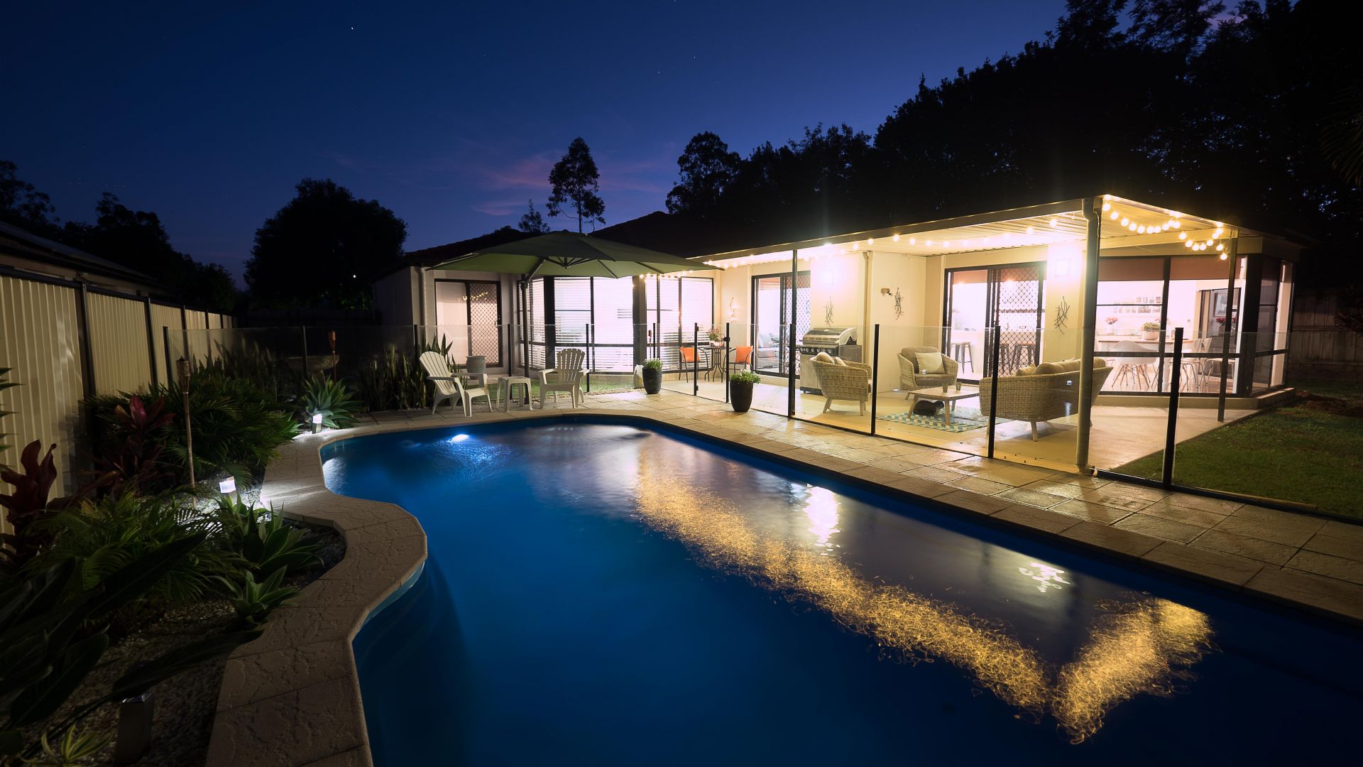 Easily access the in ground salt water pool from the kitchen via the covered entertainment area.
