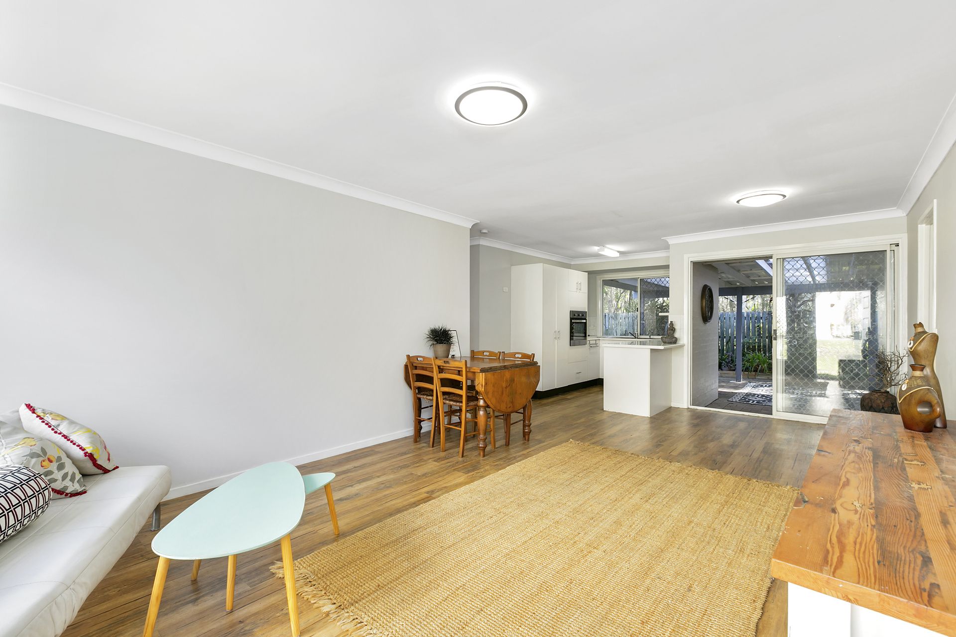 The open plan kitchen dining and living space is light filled and flows out to the outdoor area.