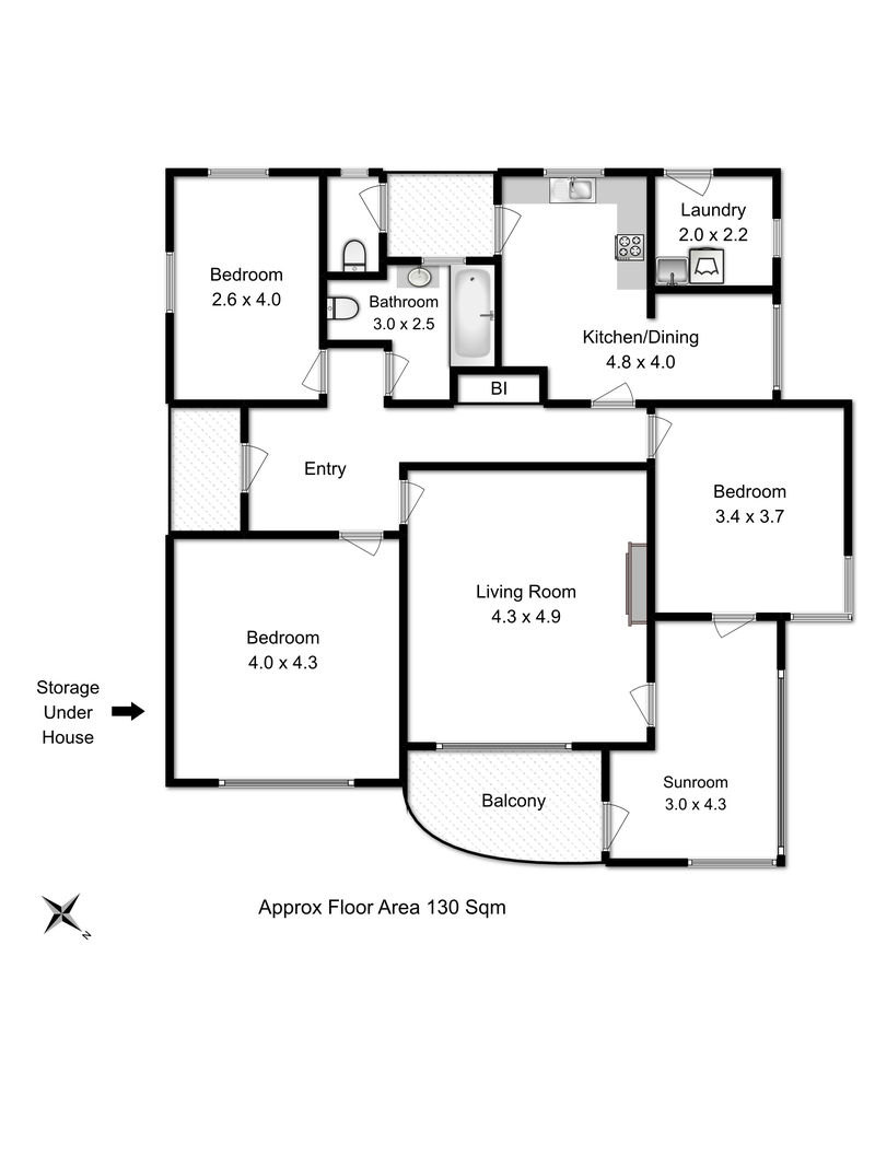 The current floor plan comprises 3 bedrooms, 1 bathroom, 2 toilets, kitchen, lounge (with open fireplace), sunroom, dining area, separate laundry and underfloor storage.