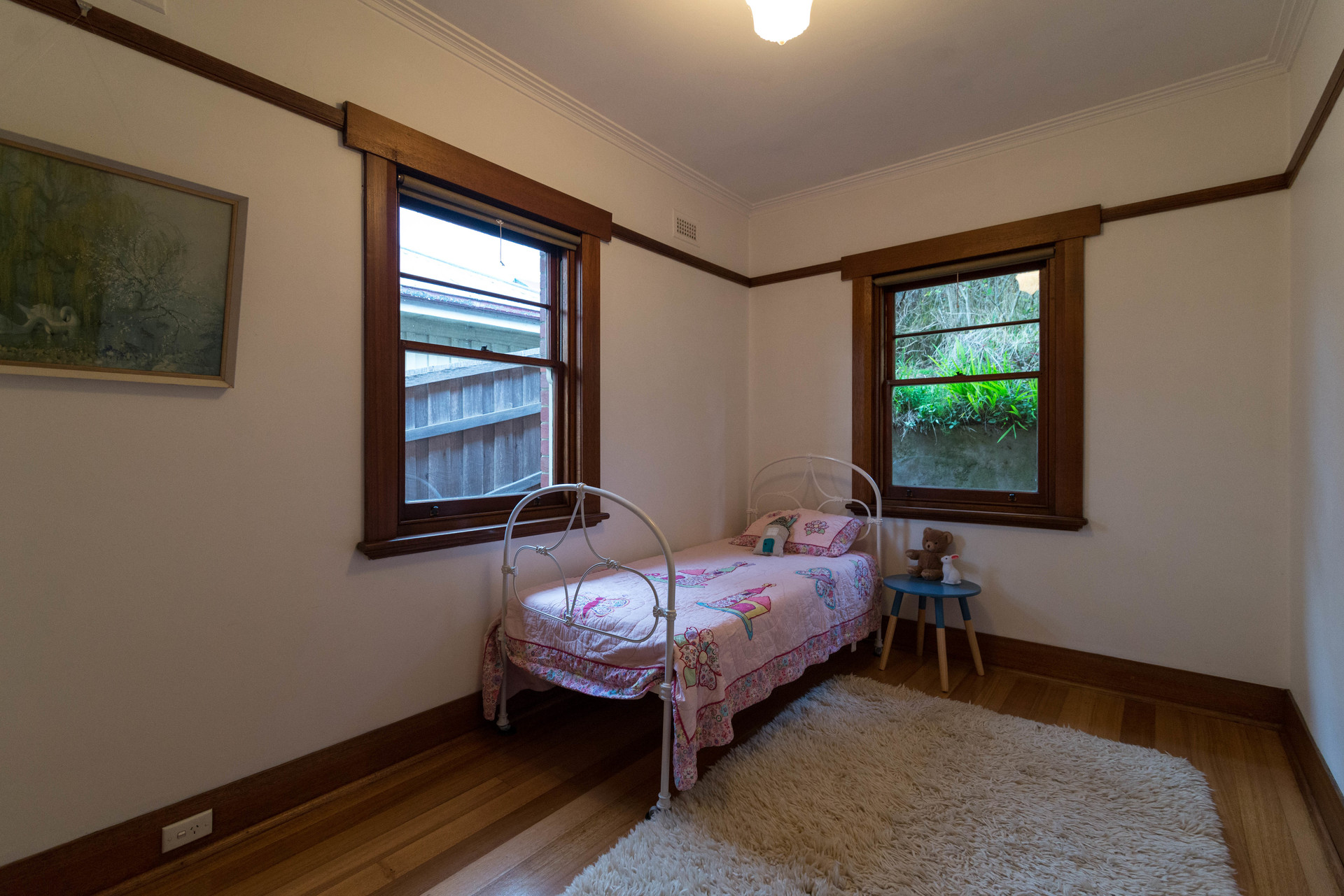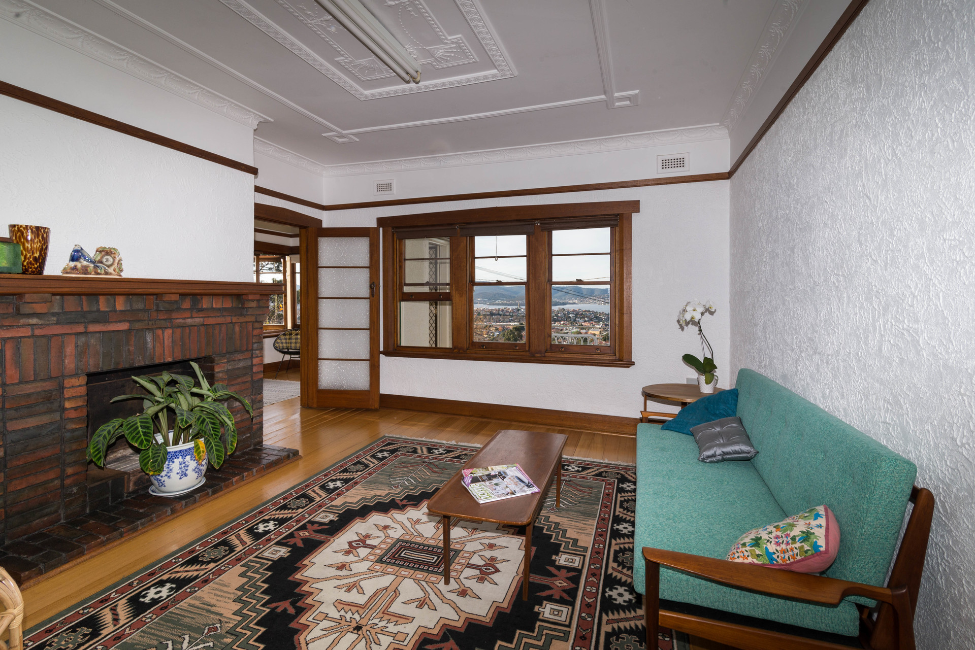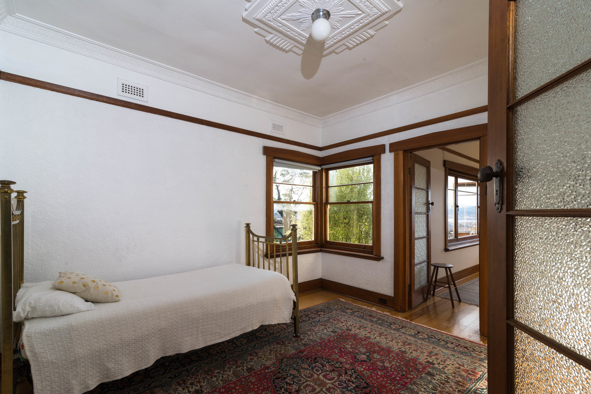 In immaculate original condition, it features polished Tas oak floors, picture rails, textured plaster walls, deco ceiling panels and decorative glass doors.