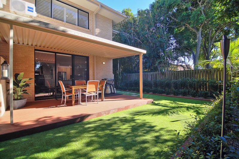 Private alfresco covered deck with low maintenance gardens