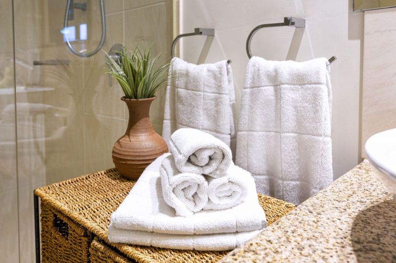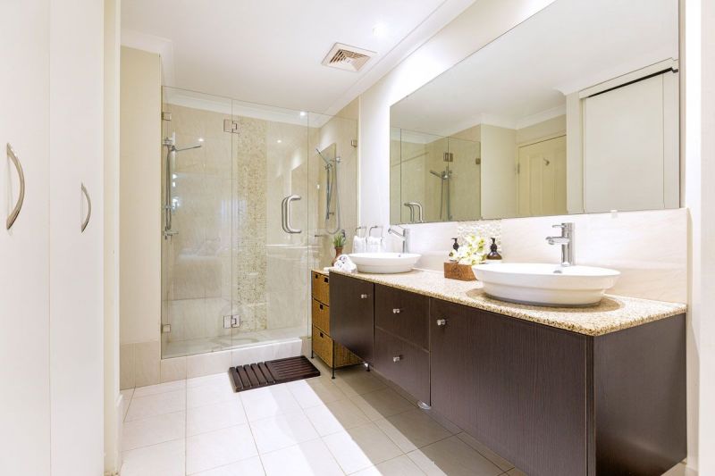 The beautiful bathroom featuring stone inlays has two basins plus a double shower.