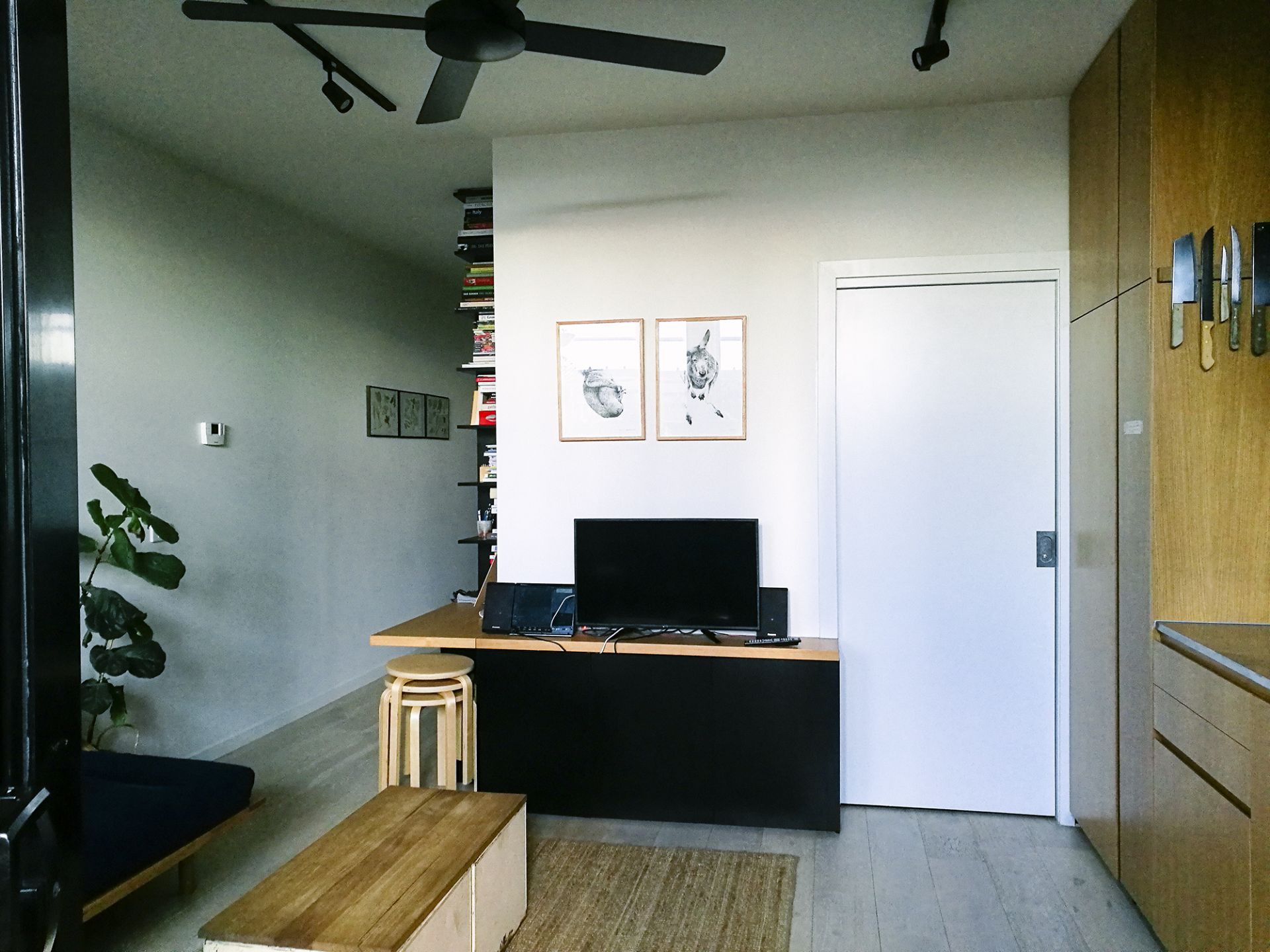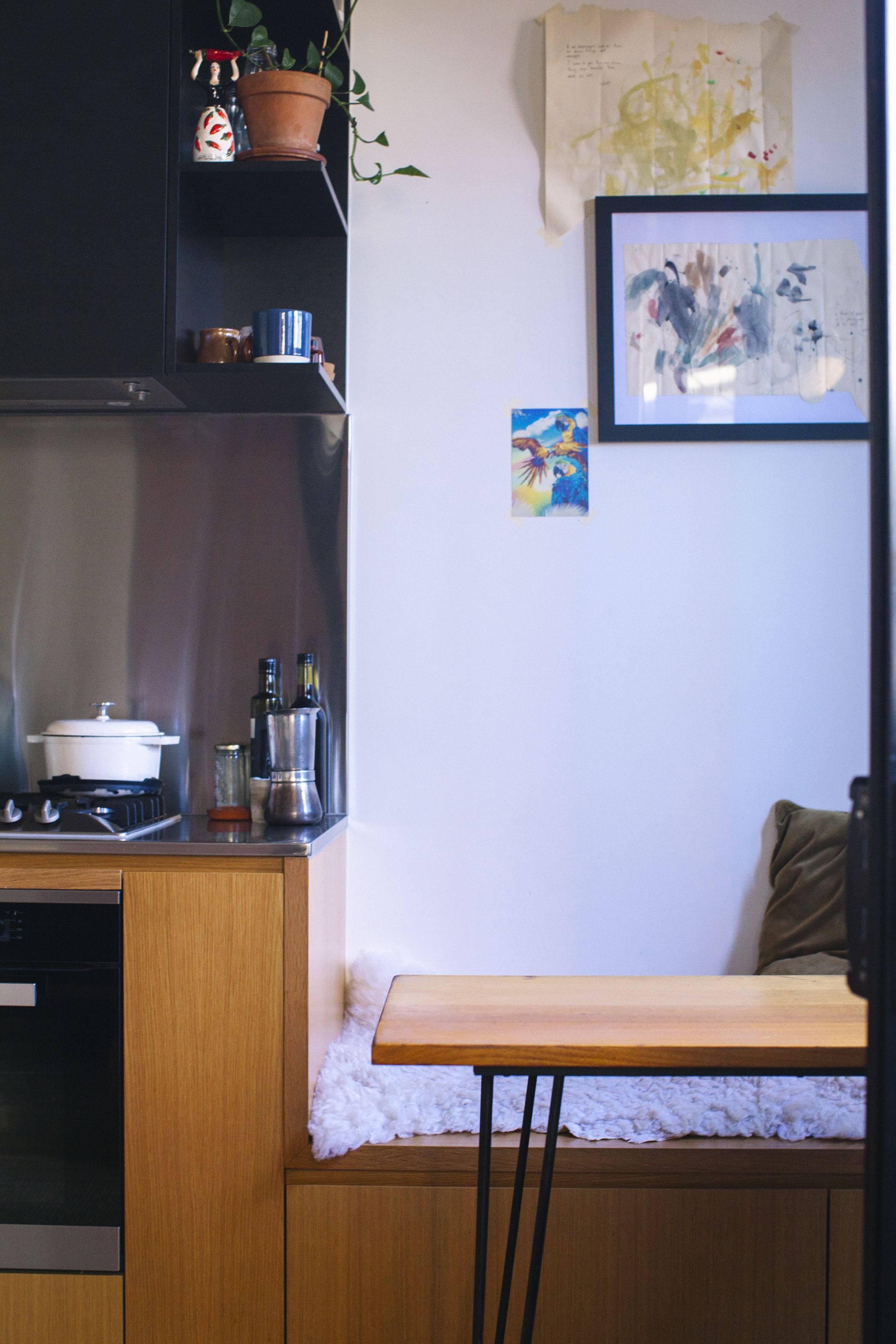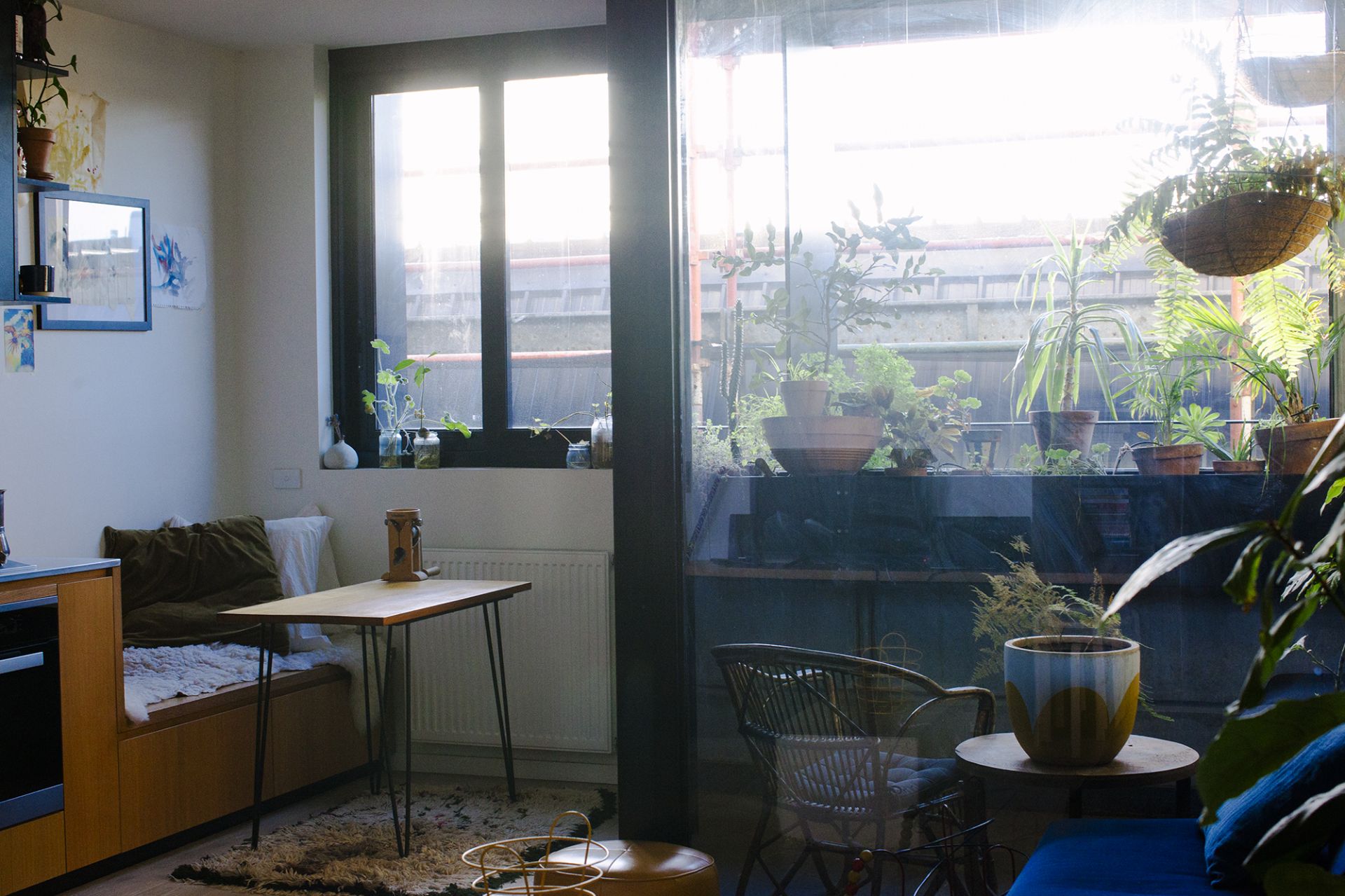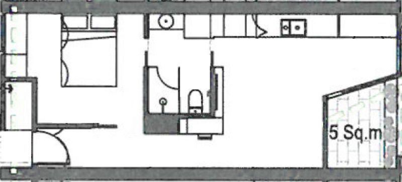 It has Engineered oak floorboards throughout with polished concrete in the bedroom and a tiled area outside. The high ceilings, and large glass panels make the apartment feel even more spacious and bright. The wooden/ply kitchen, has ample storage space, almost brand new kitchen (Miele oven and gas cooktop) and water filter (all just one year old).