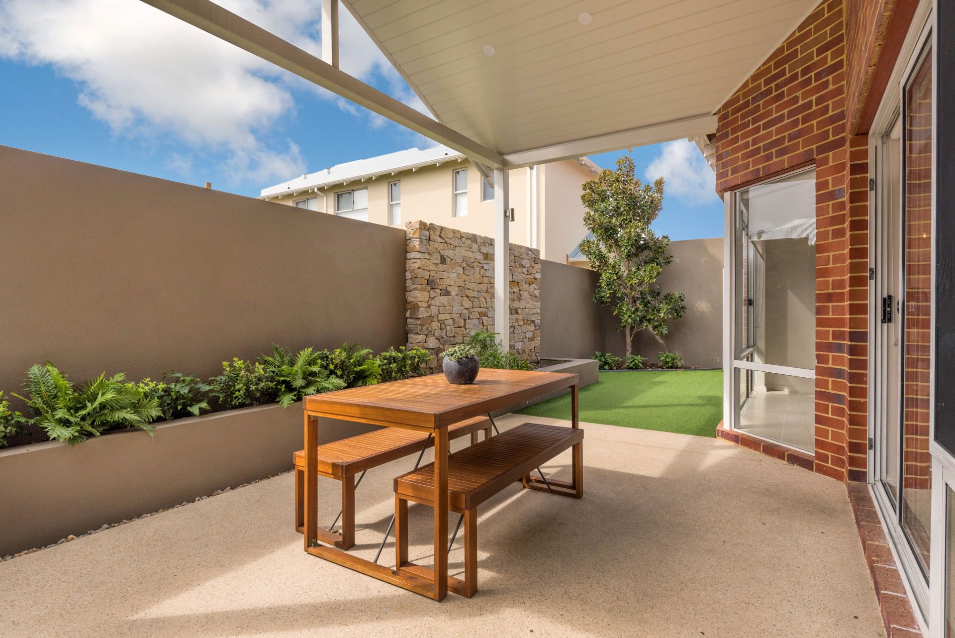 Boundary fences are part rendered brick & part slatted aluminium