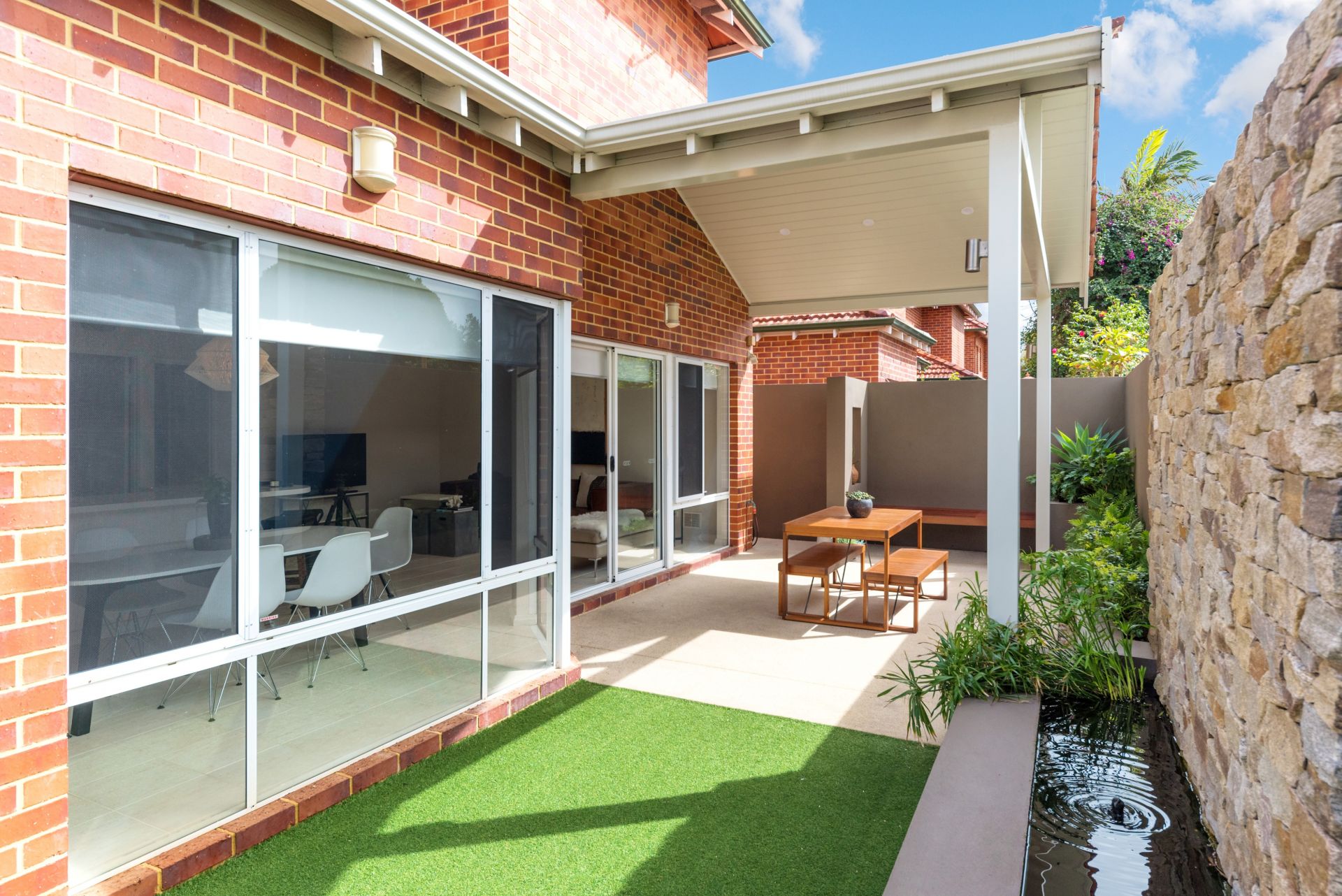 Stunning Alfresco with honed concrete floor, stone water feature & custom made day bed